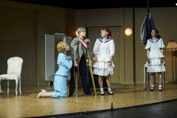 „Burgtheater“-Szene am Burgtheater (v. li.): Birgit Minichmayr, Mavie Hörbiger, Maja Karolina Franke, Alla Kiperman. (Foto: © Tommy Hetzel / Burgtheater Wien / Wiener Festwochen)
