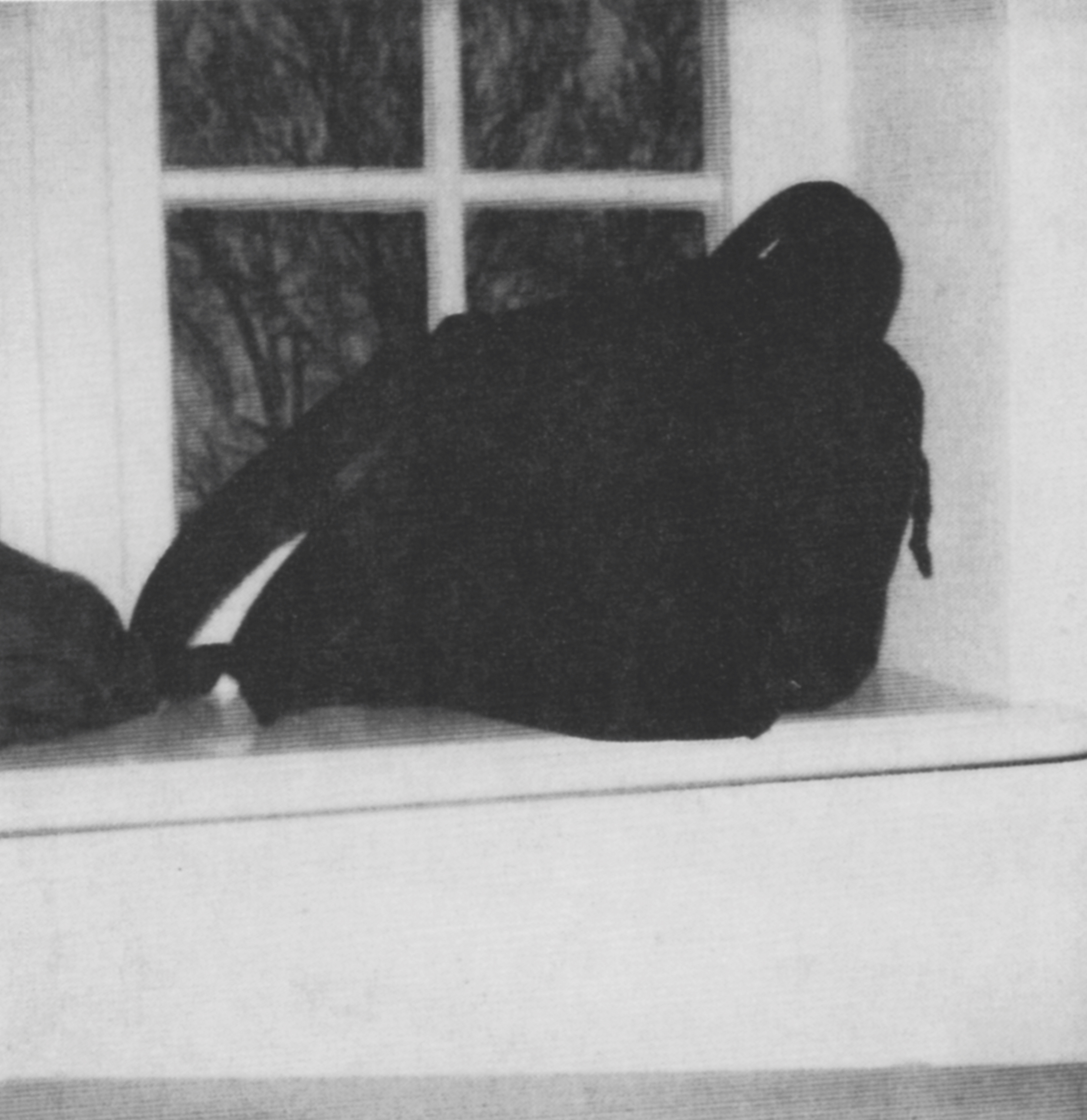 Fotovorlage mit abgelegtem Rucksack: Foto vom 11. Dezember 1990, Schloss Solitude, Stuttgart (aus: K. R. H. Sonderborg, Manfred de la Motte/Georg Nothelfer, Berlin 1991)