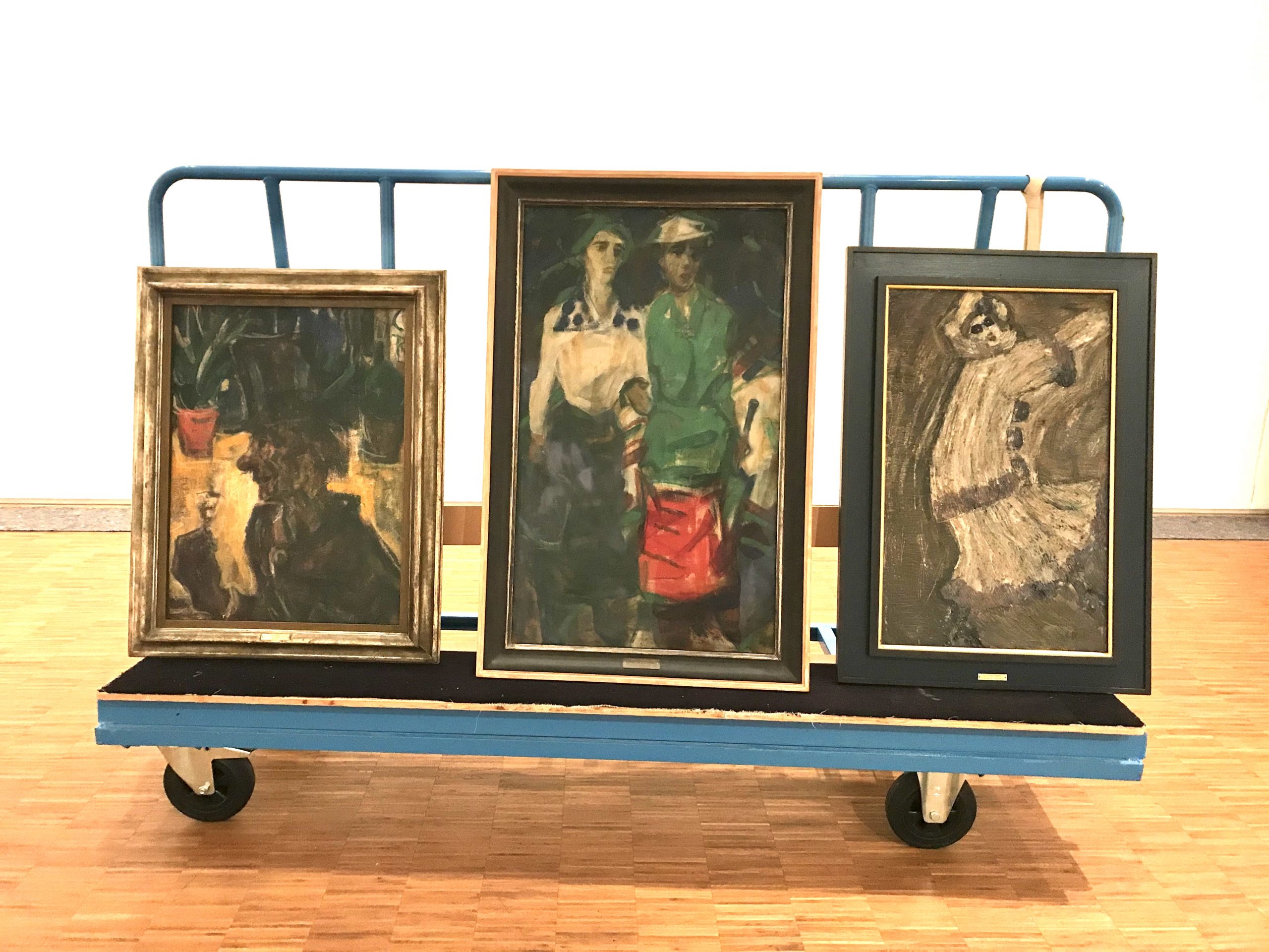 Ungewöhnliche Ansicht während des Ausstellungs-Aufbaus Mitte Januar: Drei Gemälde von Christian Rohlfs auf Transportwagen. Von links: „Der Trinker“ (um 1915), „Zwei Mädchen“ (um 1917) und „Pierrette“ (um 1911). (Foto: Bernd Berke)