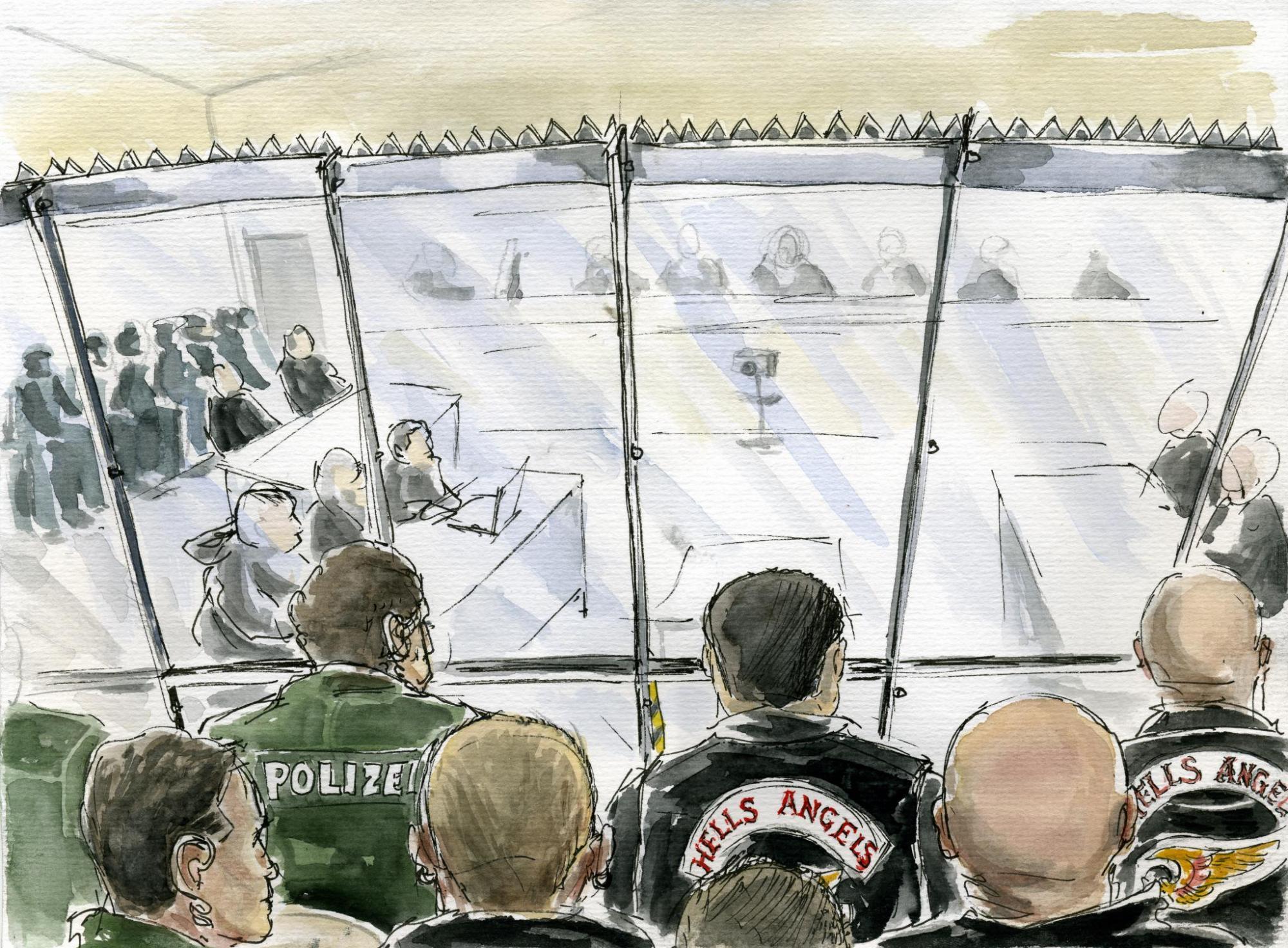 Martin Burkhardt: Rocker-Prozess in Kaiserslautern. Der Gerichtssaal wurde eigens umgebaut, Panzerglas und Stahldornen trennten den Zuschauerraum von den Verfahrenparteien.