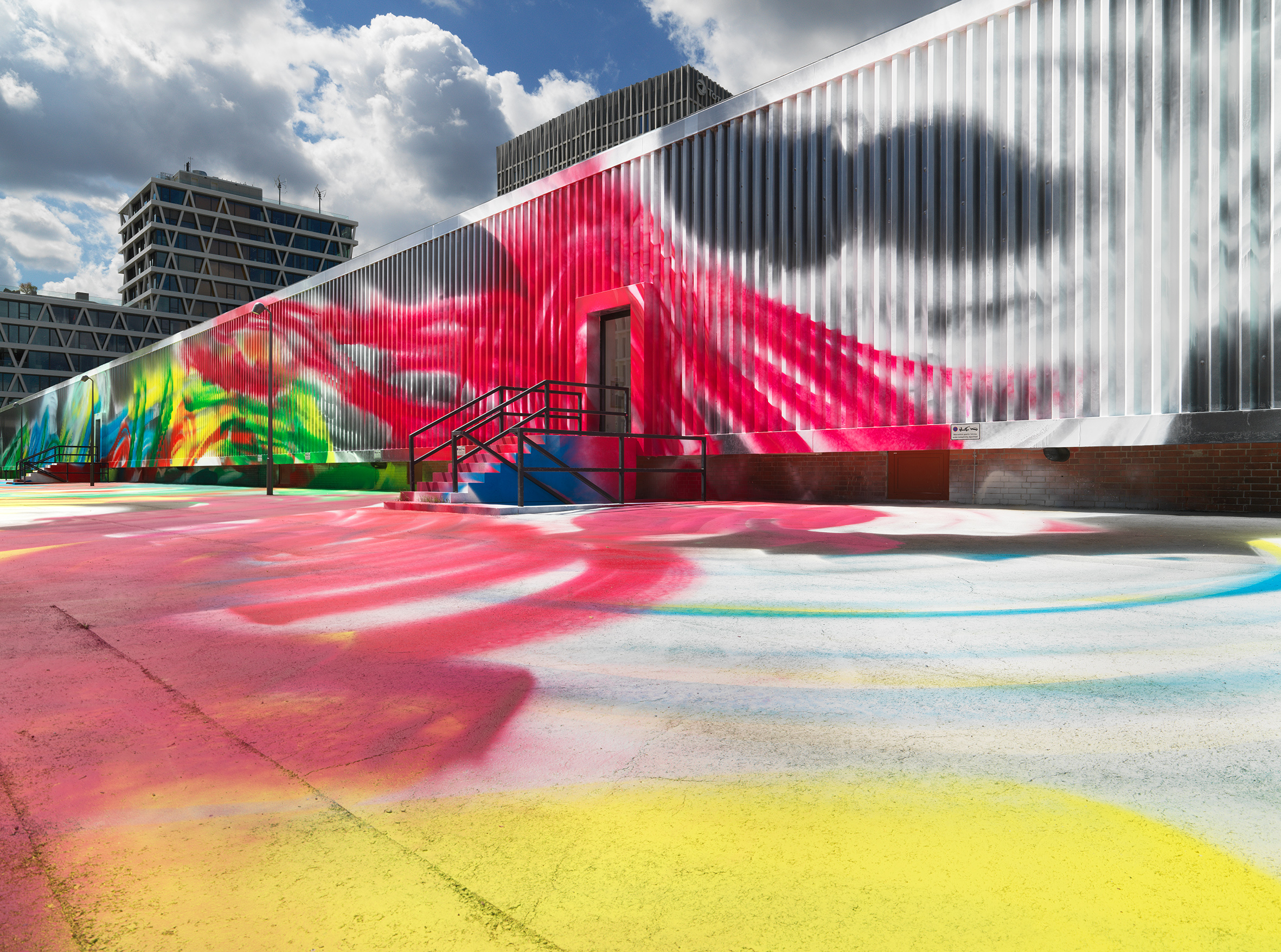 Katharina Grosse „It Wasn’t US“. Ausstellungansicht Hamburger Bahnhof – Museum für Gegenwart – Berlin 2020 (Courtesy König Galerie, Berlin/London/Tokyo /Gagosian / Galerie nächst St. Stephan Rosemarie Schwarzwälder, Wien / @ Katharina Grosse / VG Bild-Kunst, Bonn 2020 / Foto: Jens Ziehe)