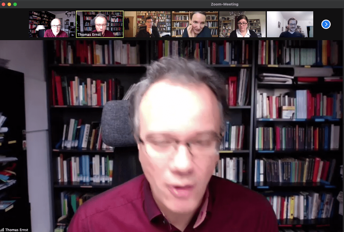 Unscharfer Screenshot der Videokonferenz-Tagung: Prof. Thomas Ernst beim Kurzvortrag, in der Bildleiste darüber weitere Tagungs-Teilnehmer(innen).