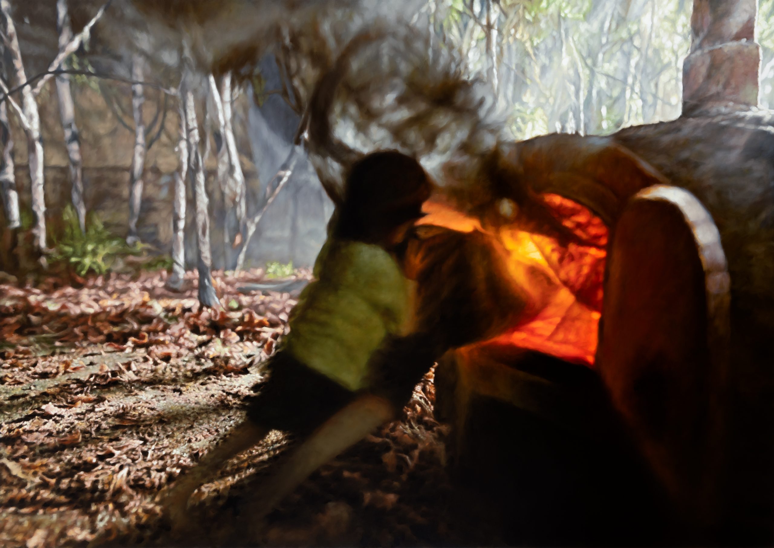 Philipp Fröhlich: „Da gab ihr Gretel einen Stoß, dass sie weit hineinfuhr, machte die eiserne Tür zu und schob den Riegel vor“, 2018. Öl auf Leinwand, 195×275 cm (©Philipp Fröhlich)
