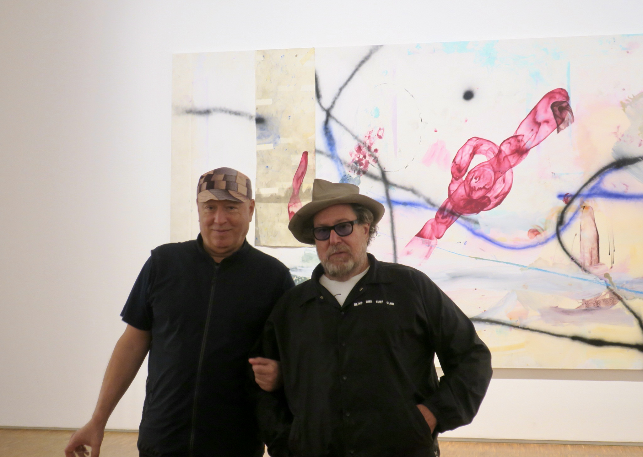 Jiří „Georg“ Dokoupil (li.) und JUlian Schnabel vor einem ihrer Gemeinschaftsbilder im Hagener Osthaus Museum. (Foto: Bernd Berke)