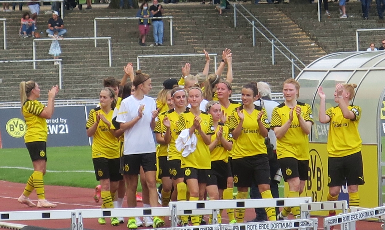 Olé, hier kommt der BVB, und zwar das Frauenteam; hier beim Schlussapplaus. (Foto: Bernd Berke)