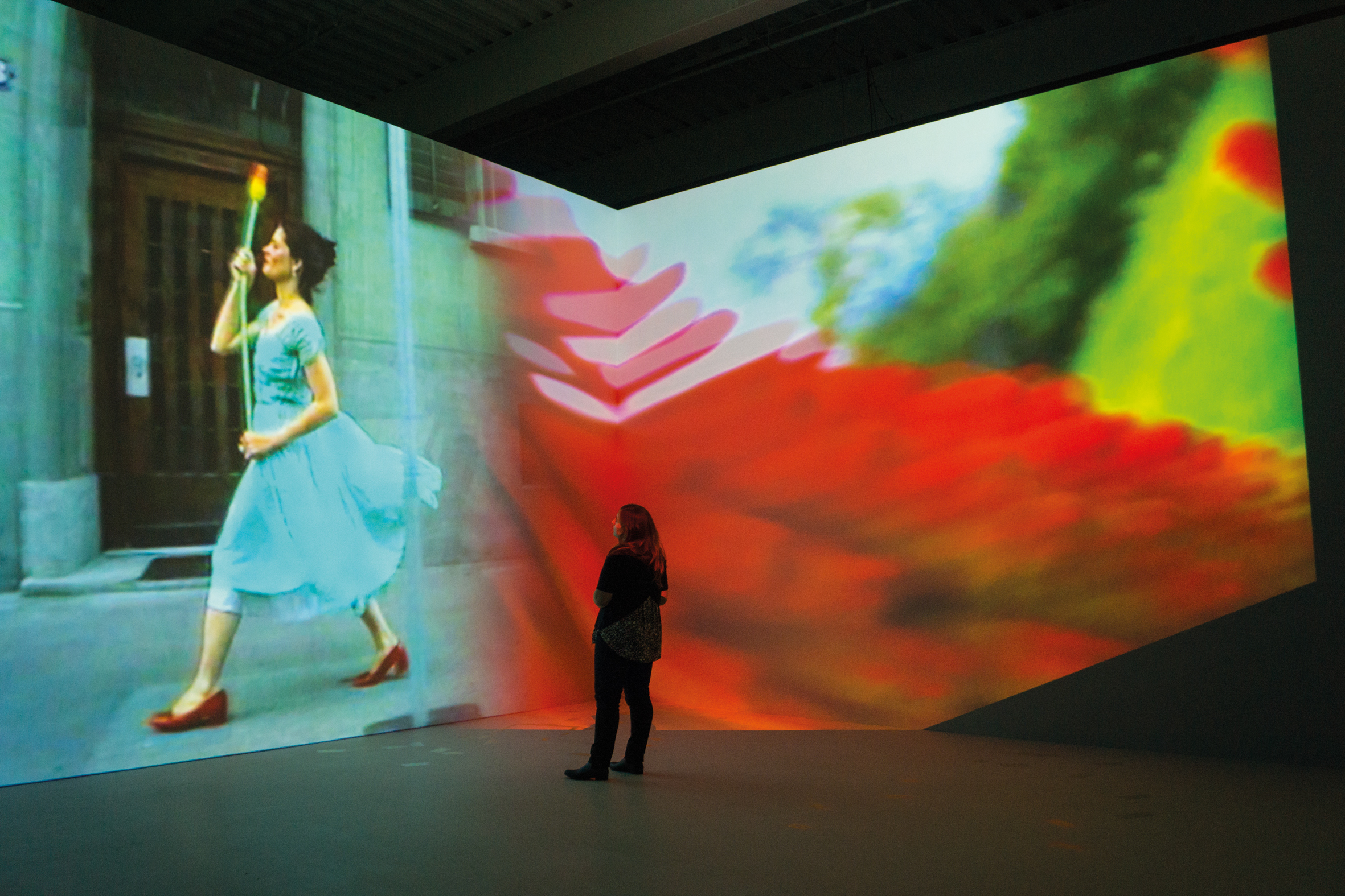 Feministischer Impuls: Frau zerschlägt mit Blumen-Nachbildung als „männlich“ gedachte Autoscheiben. – Pipilotti Rist „Ever Is Over All“, 1997, 2-Kanal-Videoinstallation, 4:09 min (Zyklus Smash) bzw. 8:25 min (Zyklus Flower), Farbe; Sound © Anders Guggisberg & Pipilotti Rist, Maße variabel, Edition 1/3 + e. a. (Privatsammlung | VG Bild Kunst, Bonn 2022, Foto: Ron Amstutz)