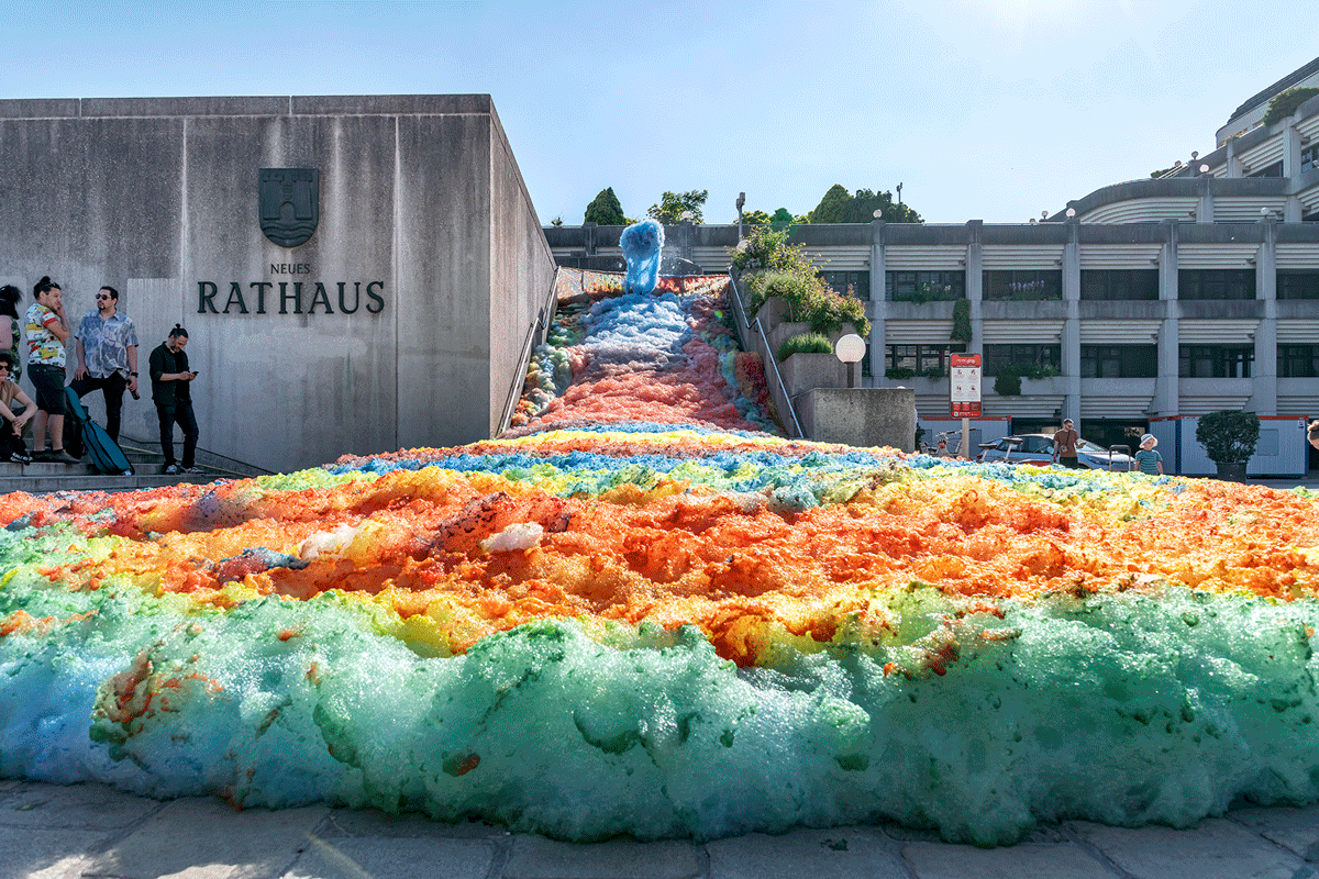Durch Schaum überfluteter und dadurch verwandelter Stadtraum: Stephanie Lüning „Island of Foam“ (Schauminsel), Version XIV, 2021, in Linz/Österreich. (Foto: © Violetta Walkobinger)