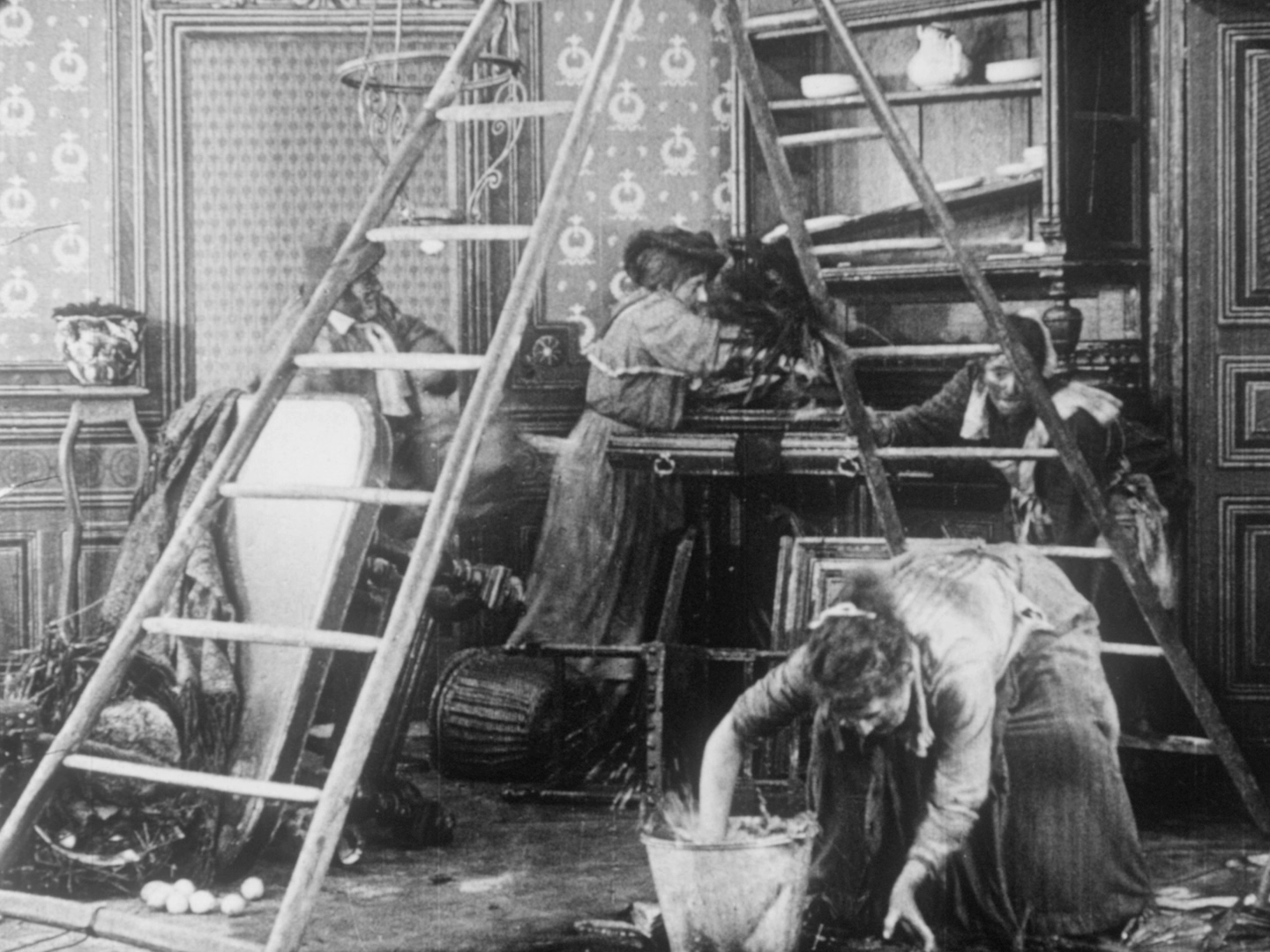„Aufräumen“, dass die Bude wackelt – Szene aus dem französischen Stummfilm „Cunégonde reçoit sa famille“ (1912). (Frauen Film Festival IFFF Dortmund + Köln / Filmmuseum EYE, Amsterdam)