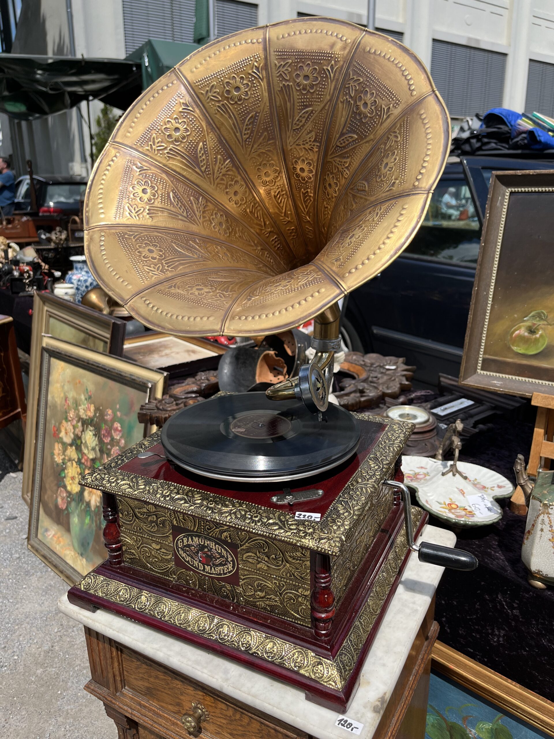 Abspielgerät aus der Zeit, als Hymnen noch anders gewertet wurden: Grammophon auf dem Flohmarkt. (Foto: Bernd Berke)