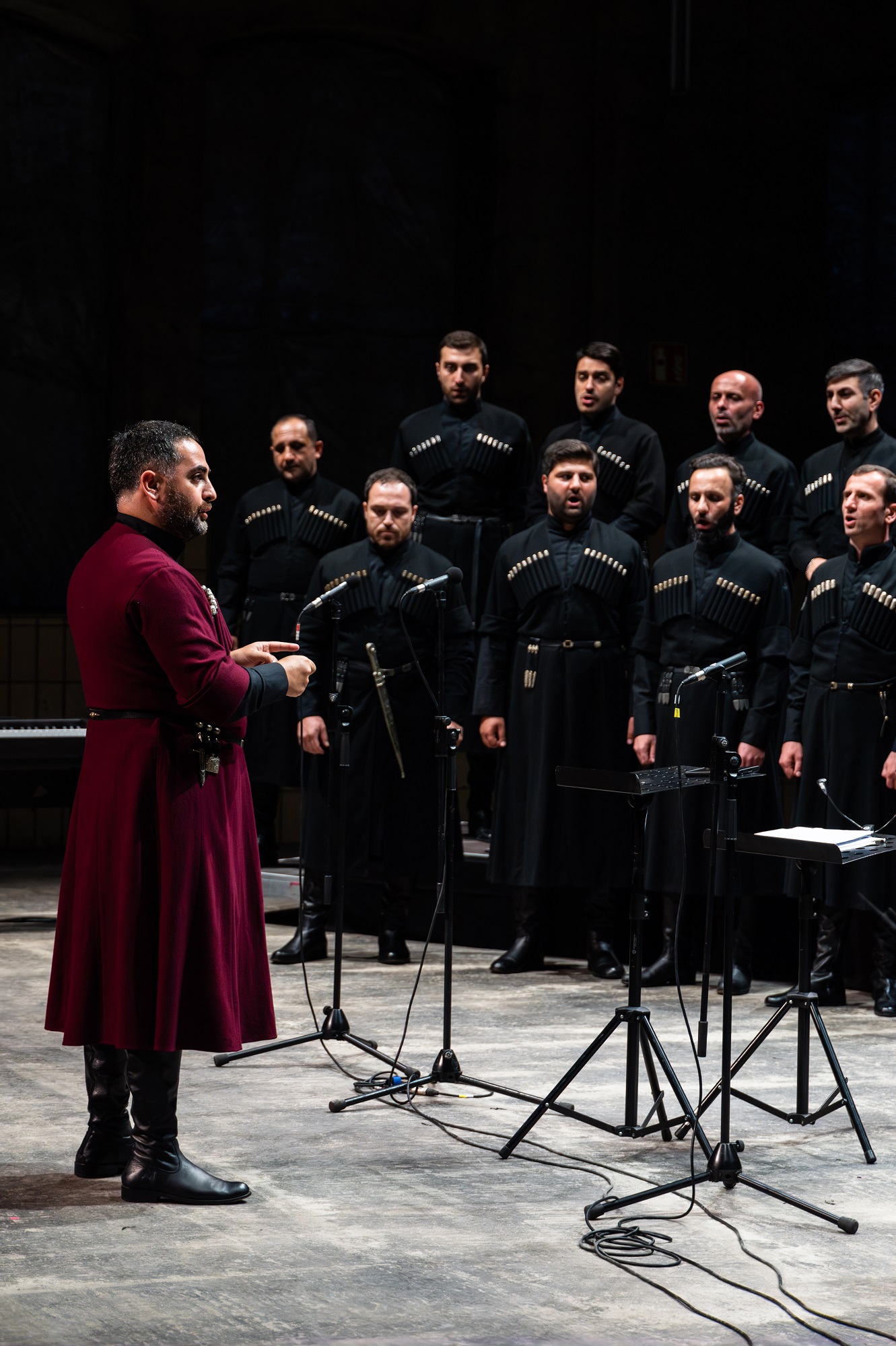 Georgi Donadze dirigierte die zweite Konzerthälfte, in der die traditionelle georgische Polyphonie im Mittelpunkt stand (Foto: Der Georgian State Chamber Choir (oder Trinity Cathedral Choir) trat bei der Ruhrtriennale in der Turbinenhalle an der Jahrhunderthalle Bochum auf (Foto: Heinrich Brinkmöller-Becker)