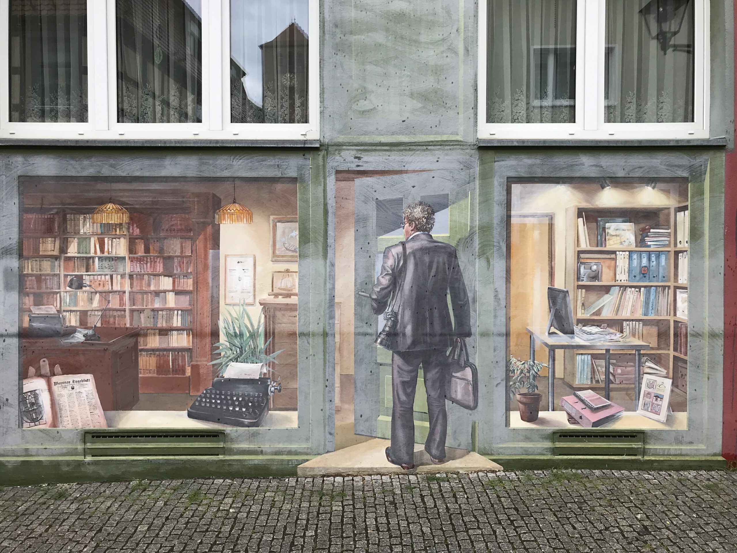Nicht, dass vom Buchhandel und Verlagswesen einst nur noch solche Wandbilder übrig bleiben… (Entdeckt am 15. Juli 2020 in Waren an der Müritz, Mecklenburg-Vorpommern). (Foto: Bernd Berke)