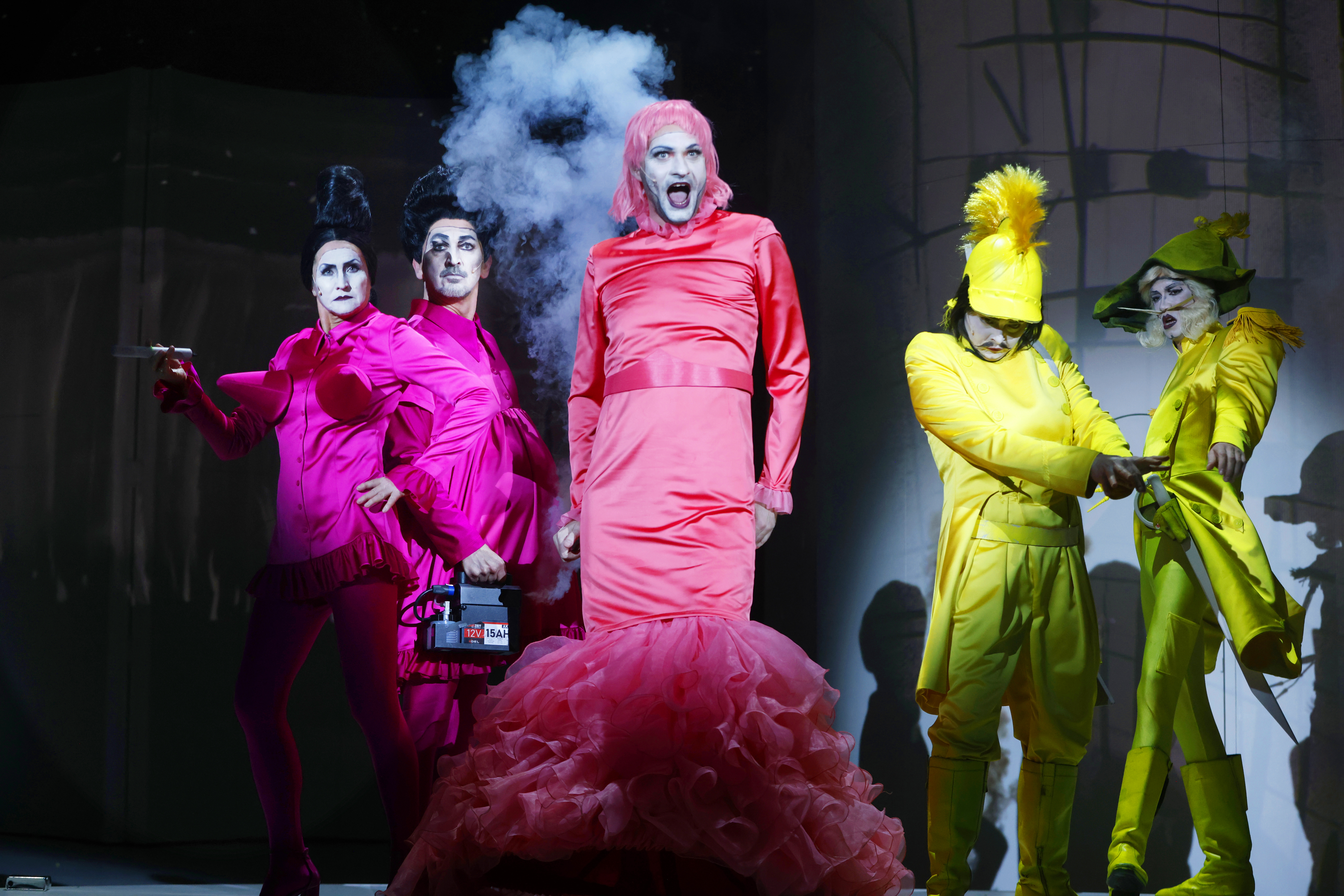 Szene aus „Carmen“ am Berliner Gorki Theater – mit (v. li.): Catherine Stoyan, Till Wonka, Lindy Larsson, Via Jikeli, Marc Benner. (© Foto: Ute Langkafel MAIFOTO)