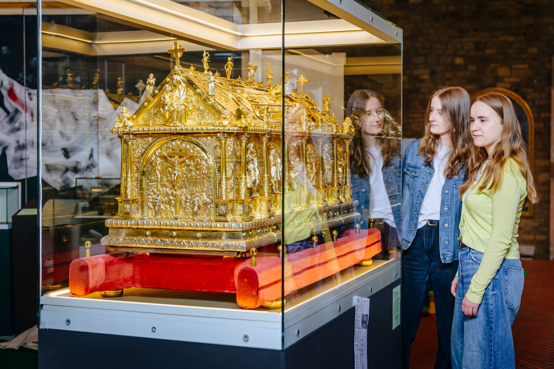 Der vergoldete Silberschrein des heiligen Liborius, des Paderborner Dom- und Bistumspatrons, sonst im benachbarten Diözesanmuseum beheimatet, gehört zu den prachtvollsten Schaustücken der Westfalen-Ausstellung. (Foto: LWL / B. Mazhiqi)