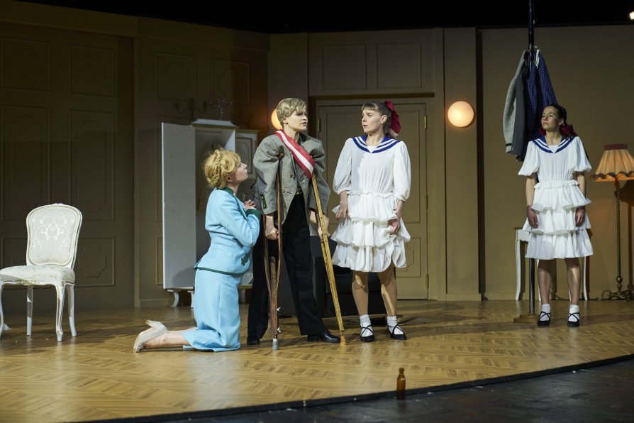 „Burgtheater“-Szene am Burgtheater (v. li.): Birgit Minichmayr, Mavie Hörbiger, Maja Karolina Franke, Alla Kiperman. (Foto: © Tommy Hetzel / Burgtheater Wien)