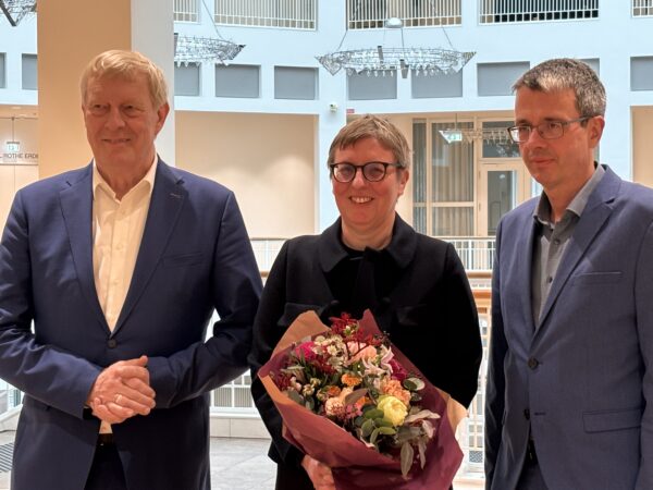 Empfang mit Blumenstrauß im Dortmunder Rathaus: Die neue Museumsleiterin Tanja Pirsig-Marshall, flankiert von Kulturdezernent Jörg Stüdemann (li.) und Stefan Mühlhofer, Leiter der Dortmunder Kulturbetriebe. (Foto: Bernd Berke)