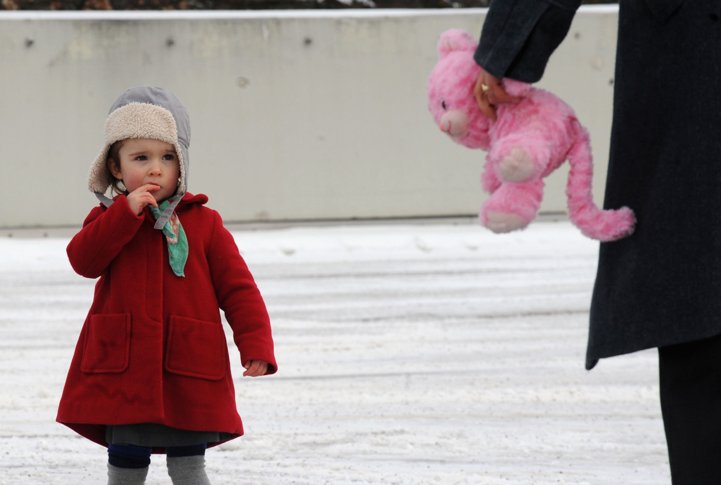 Die kleine Lara (laut Besetzungsliste Doris Marianne Müller – in Wahrheit Edwina Kuhl, Tochter von Annika Kuhl und Leander Haußmann) wurde fast zur Hauptdarstellerin. Hier bekommt sie vom Kommissar einen Teddy. (© BR/EIKON Süd GmbH/Barbara Bauriedl)