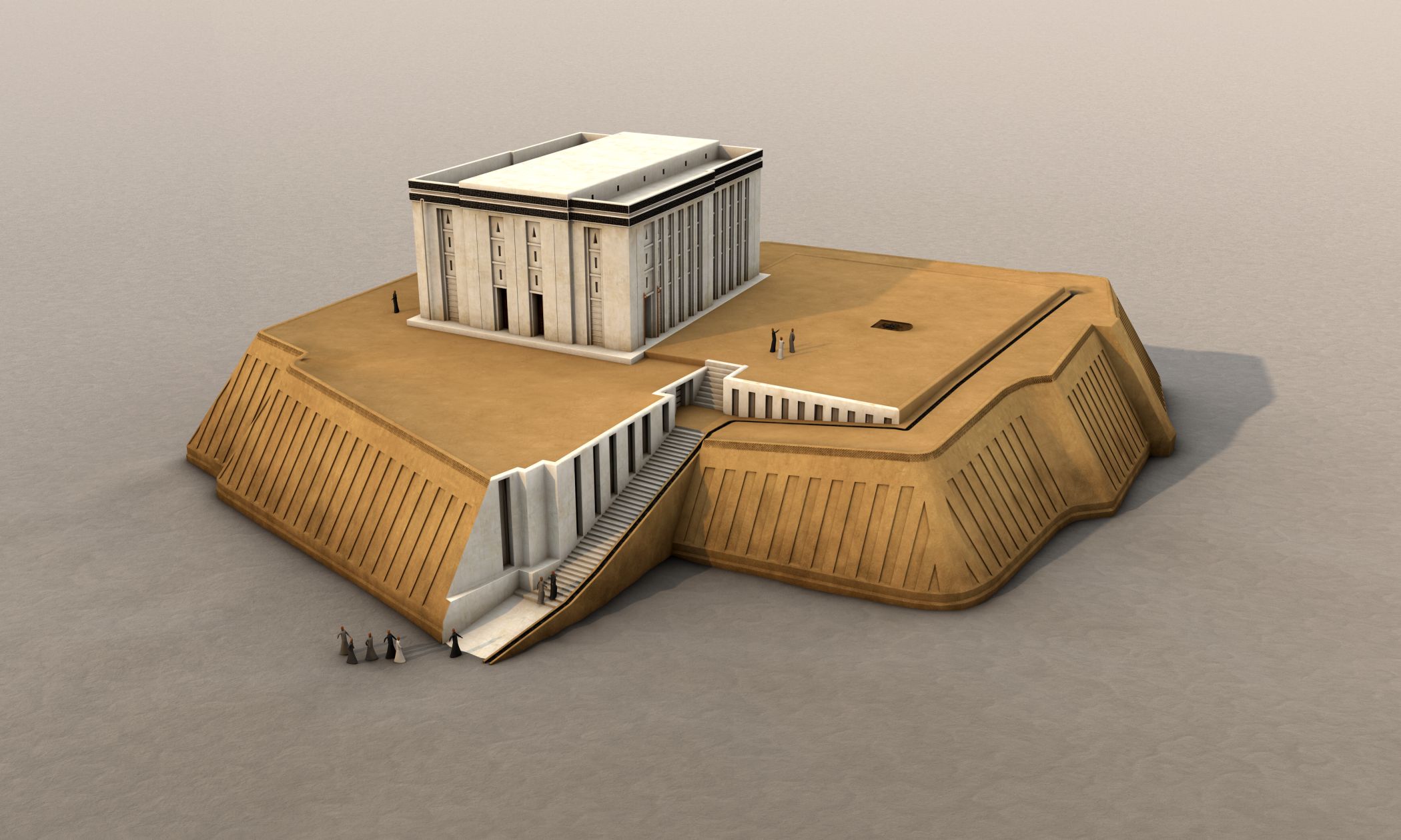 3D-Rekonstruktion des „Weißen Tempels“, der auf einer 12 Meter hohen Terrasse steht. Uruk-Zeit, um 3450 v. Chr. (© artefacts-berlin.de; wissenschaftliches Material: Deutsches Archäologisches Institut)