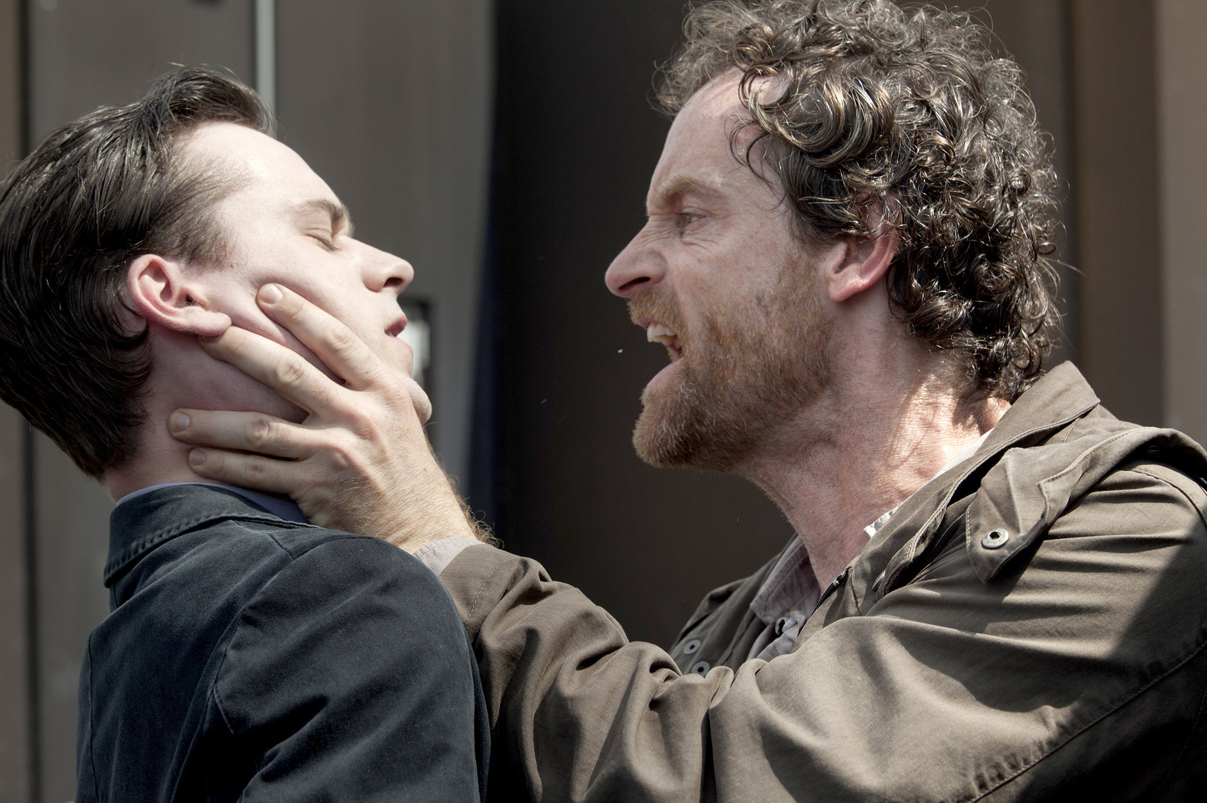 Psycho-Duell, nur selten so handgreiflich: Kommissar Faber (Jörg Hartmann, rechts) und Markus Graf (Florian Bartholomäi) (© WDR/Thomas Kost)