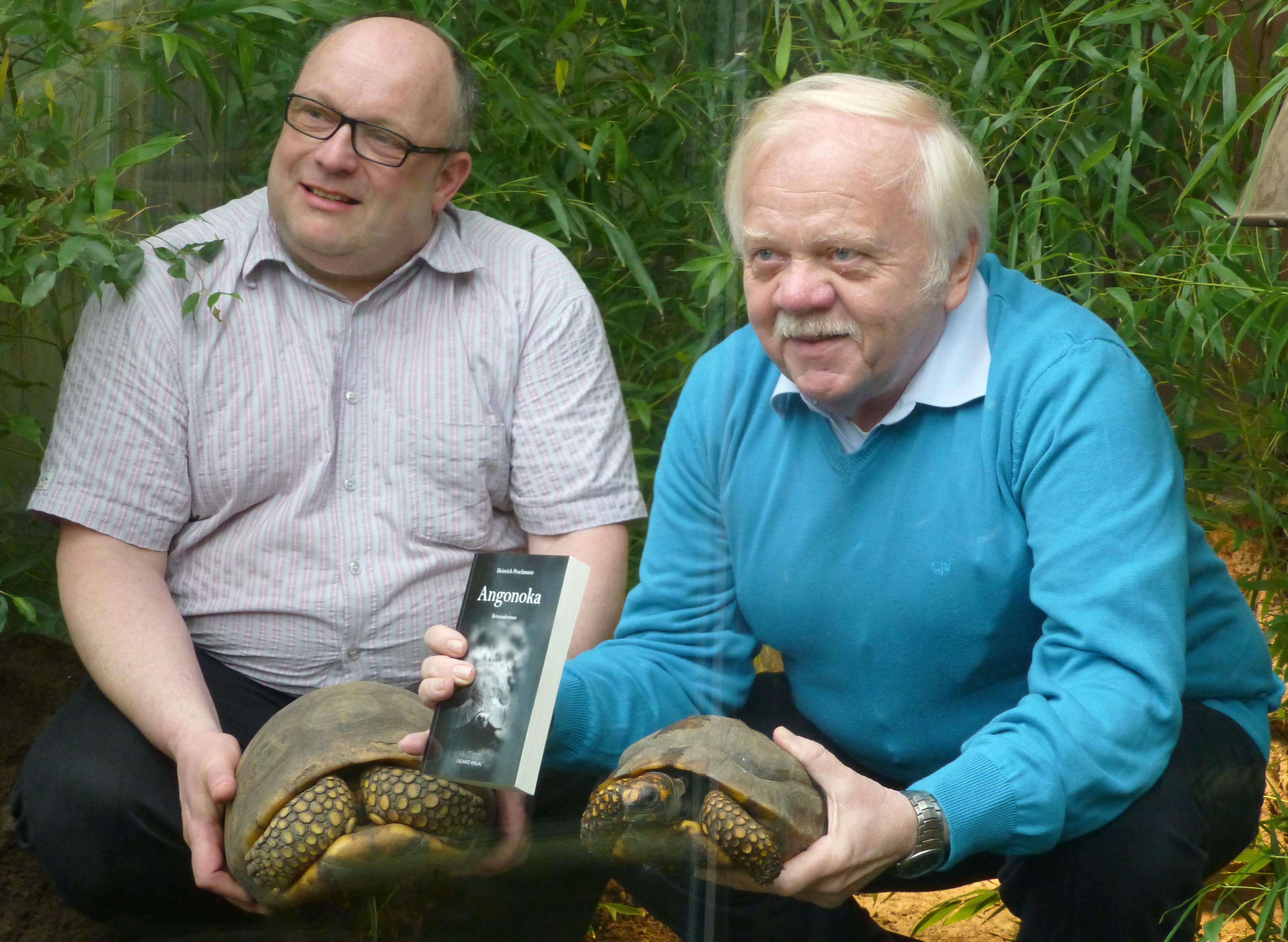 Der Autor Heinrich Peuckmann (rechts) und Dortmunds Zoodirektor Dr. Frank Brandstätter mit Schildkröten und Krimi im Amazonashaus. (Foto: Bernd Berke)
