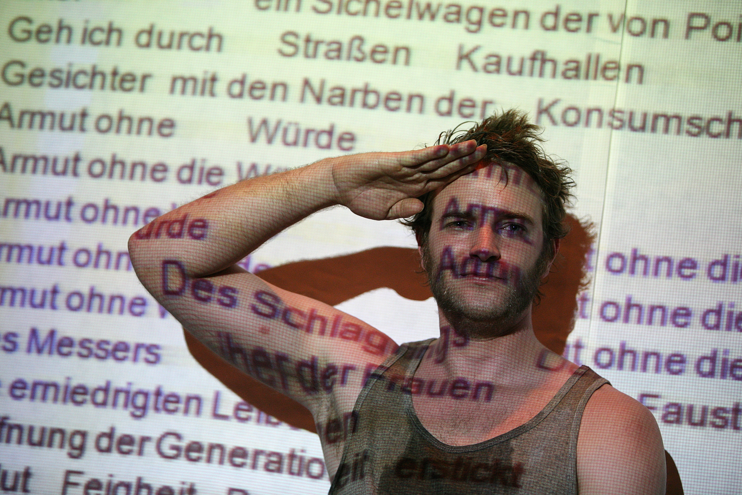 Hamlet (Sebastian Graf) salutiert vor Heiner Müllers Text. Foto: Edi Szekely