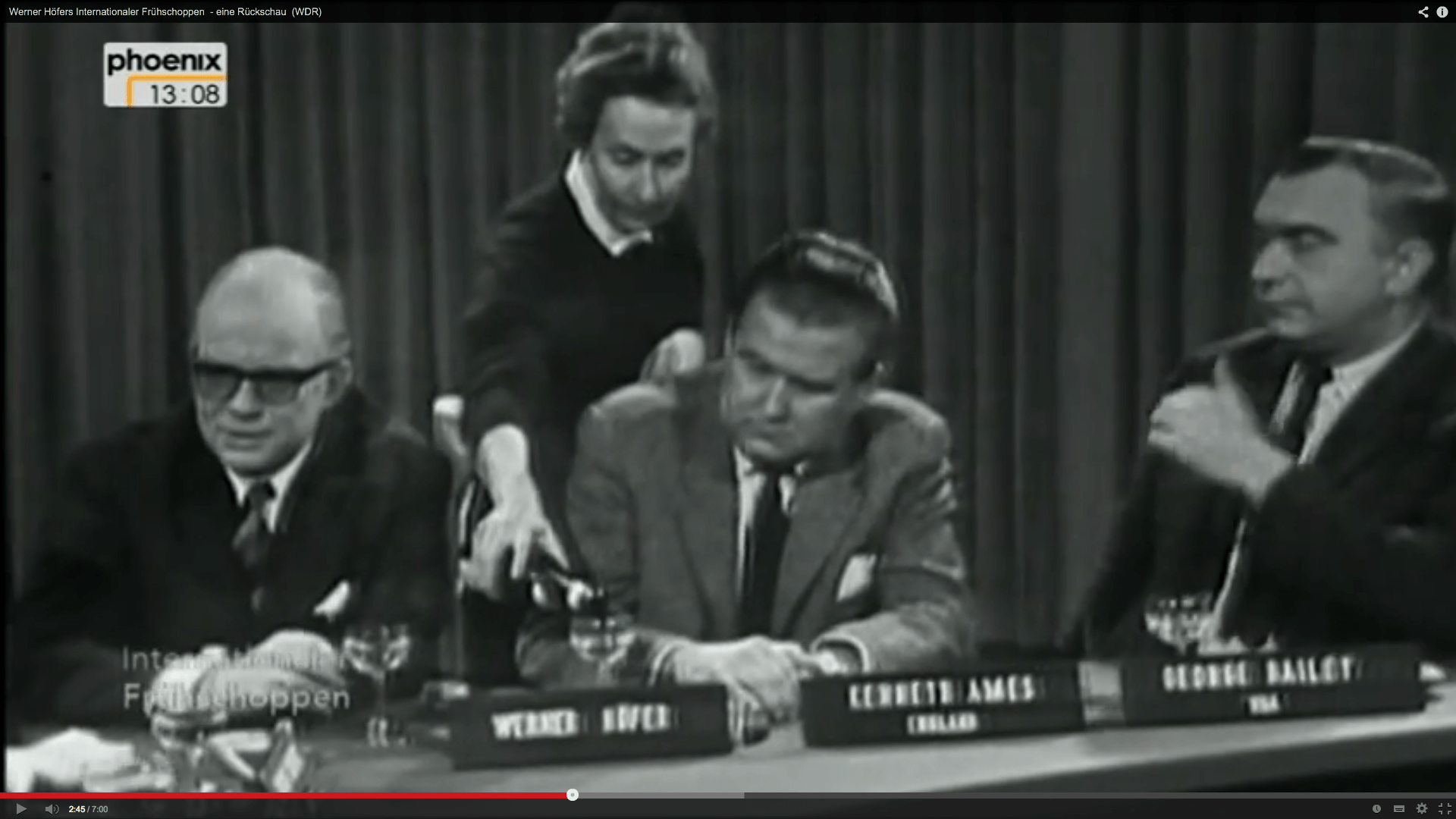 In den Anfangsjahren des „Frühschoppens“ durften Frauen bei Werner Höfer (ganz links) nicht mitreden, sondern nur Wein nachschenken. (Screenshot aus: http://www.youtube.com/watch?v=5sFe66JSaO0)