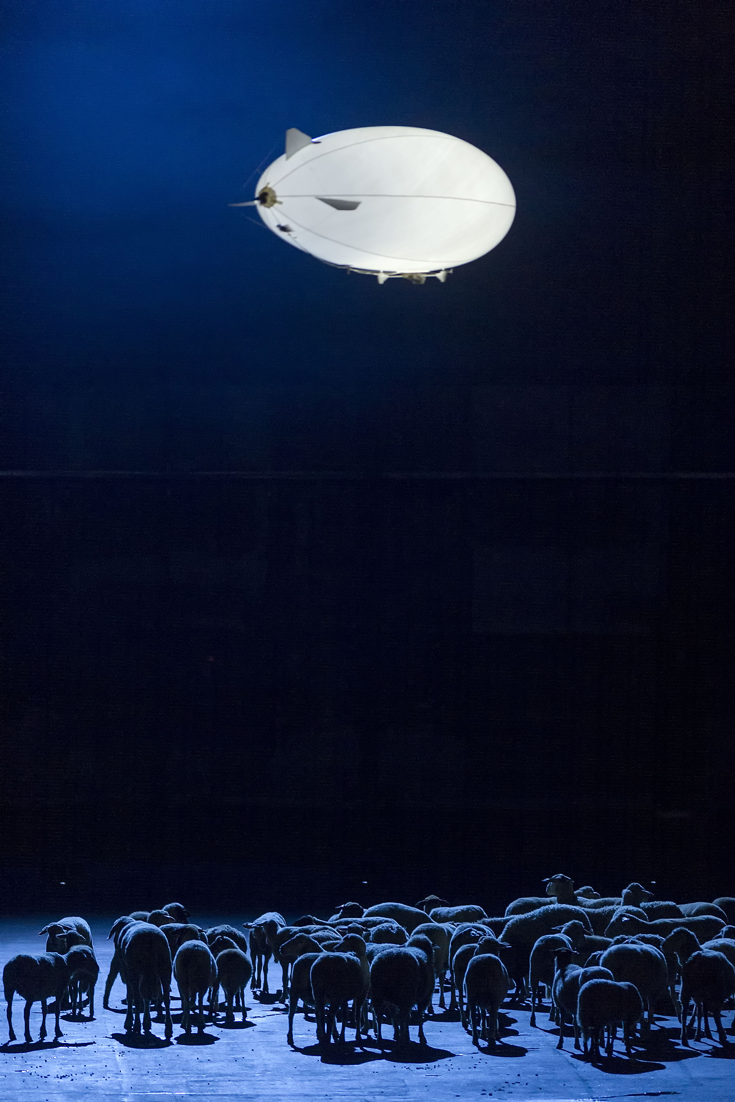 Schafe unterm Zeppelin: Szene aus der Deutschen Erstaufführung von Louis Andriessens „De Materie“ (Copyright: Wonge Bergmann/Ruhrtriennale)