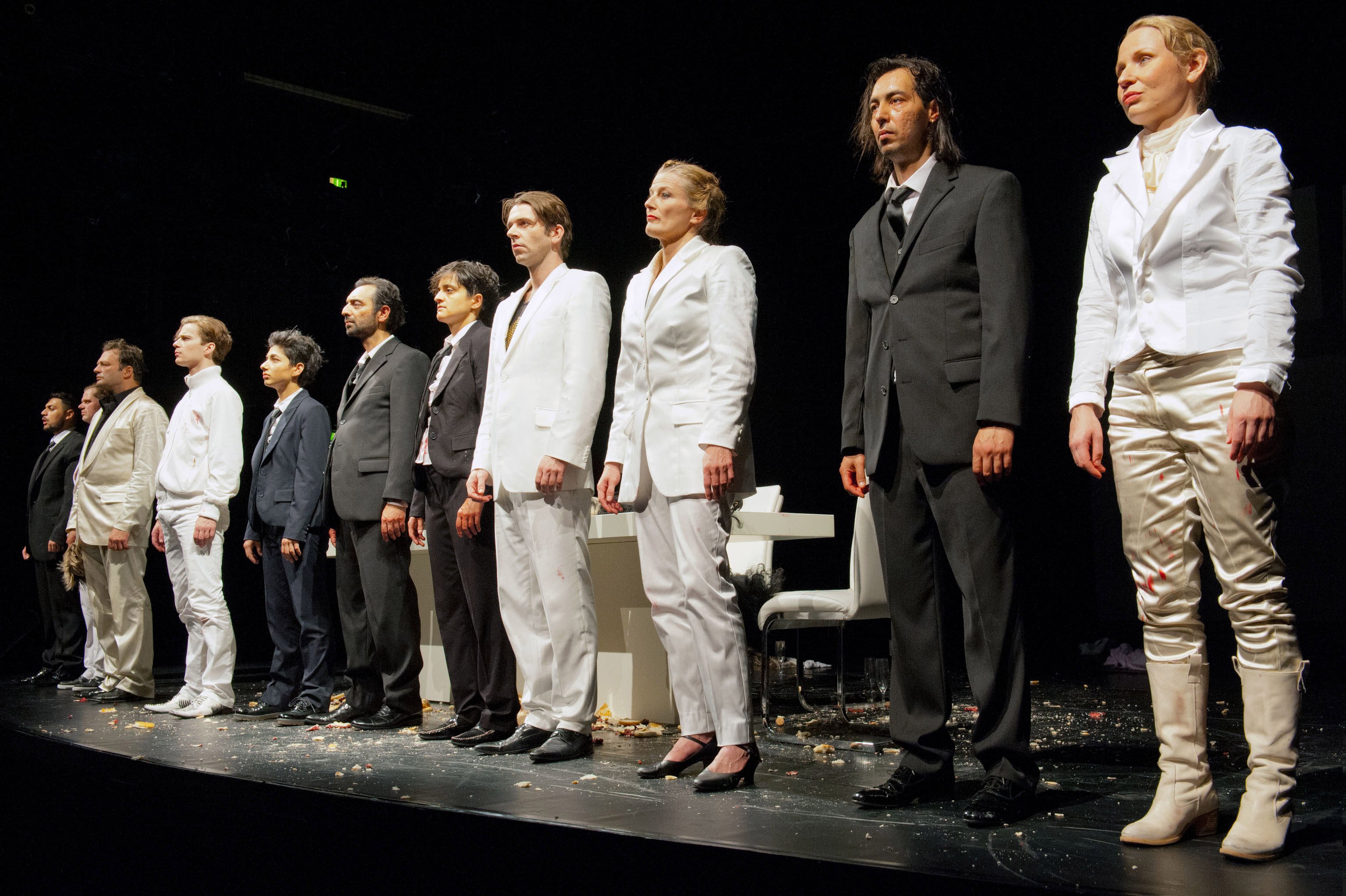 Faton Mistele, David Simon, Axel Holst, Sandra Selimovic, Slavisa Markovic, Melanie Joschla Weiß, Thomas Meczele, Ines Krug, Nebojsa Markovic, Stephanie Schönfeld in „Die Odyssee oder ‚Lustig ist das Zigeunerleben'“; Inszenierung: Volker Lösch