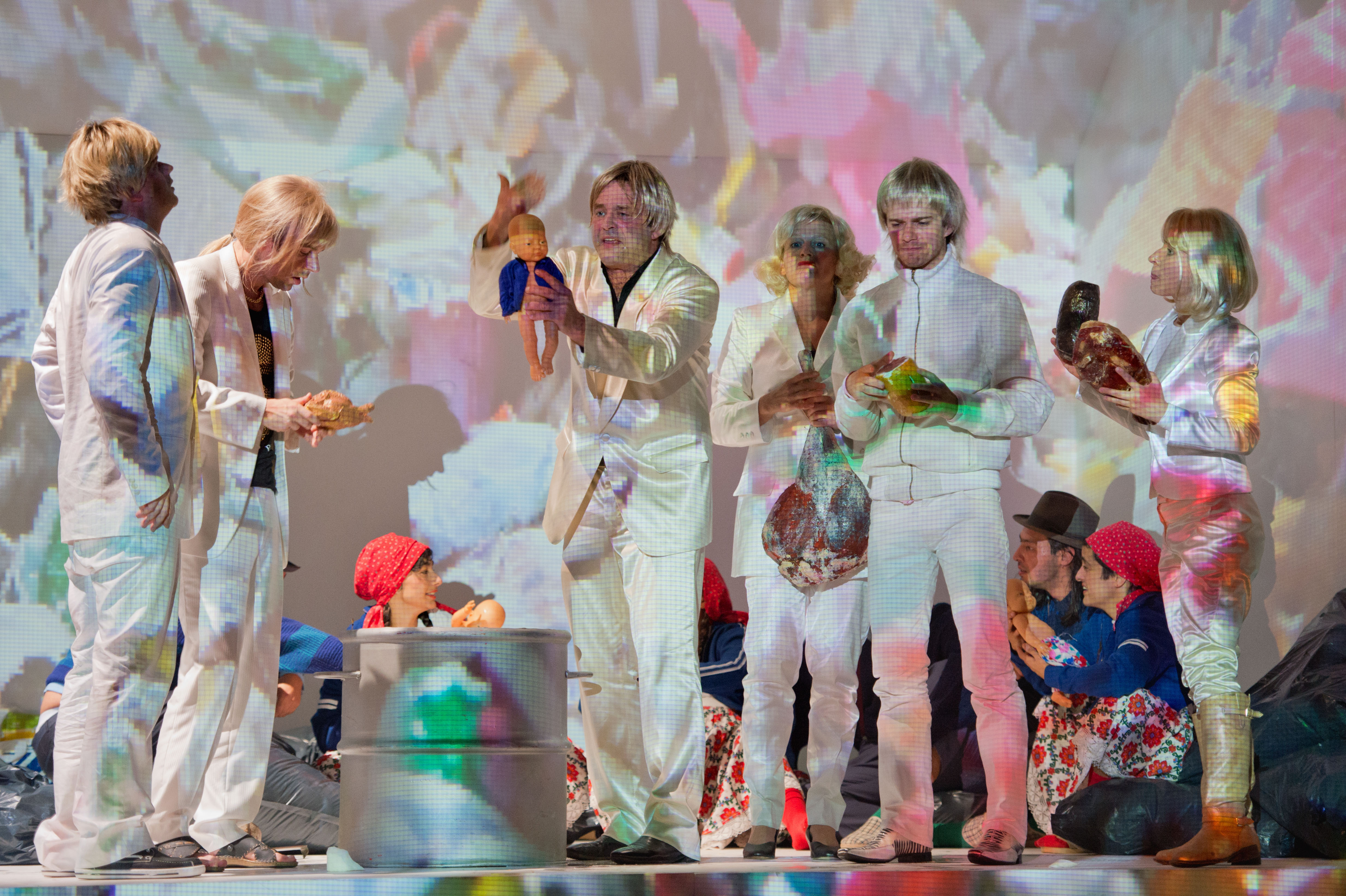 David Simon, Thomas Meczele, Axel Holst, Ines Krug, Jan Jaroszek, Stephanie Schönfeld in „Die Odyssee oder ‚Lustig ist das Zigeunerleben'“; Inszenierung: Volker Lösch