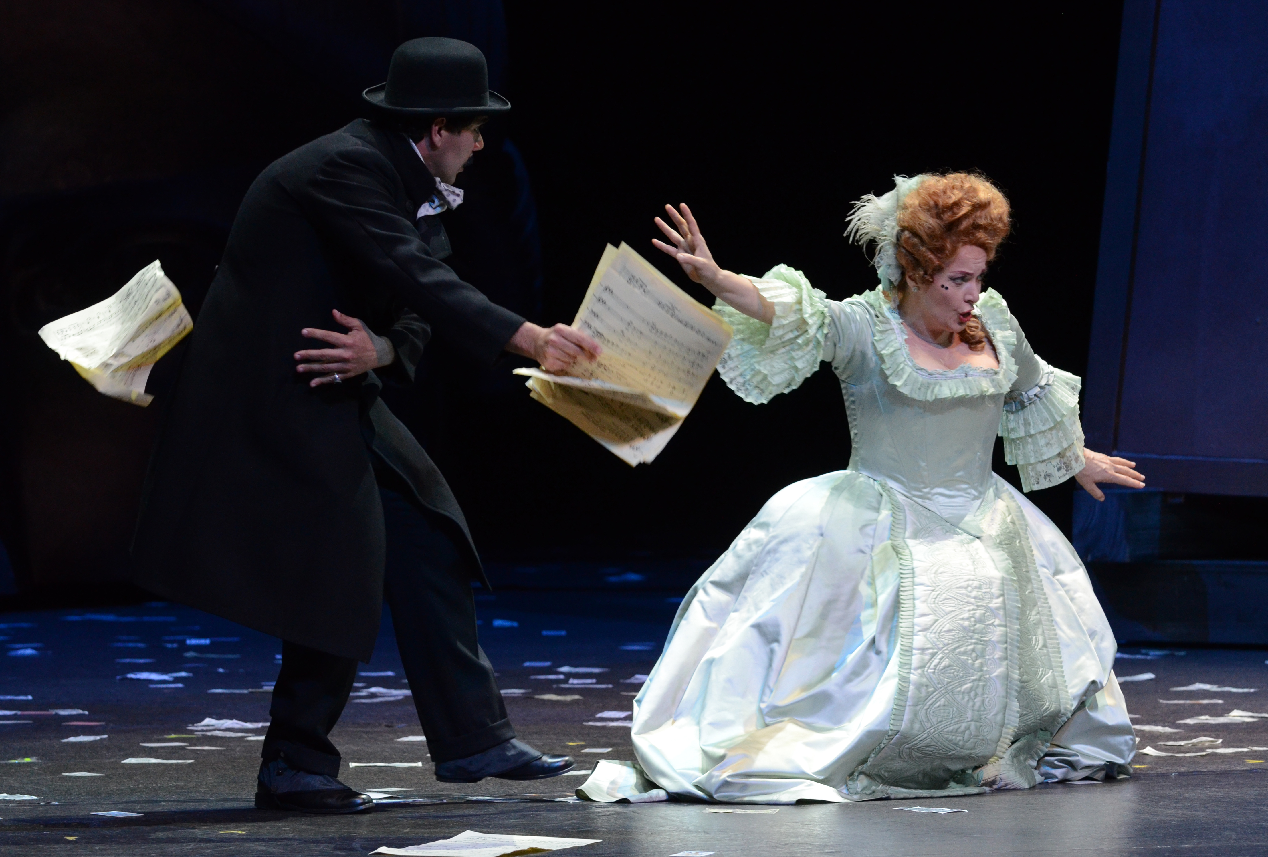 Giacomo Puccini (Mathias Kopetzki) hält Manon (Katrin Kapplusch) die Seiten seiner Partitur vor (Foto: Karl Forster/Aalto-Theater)