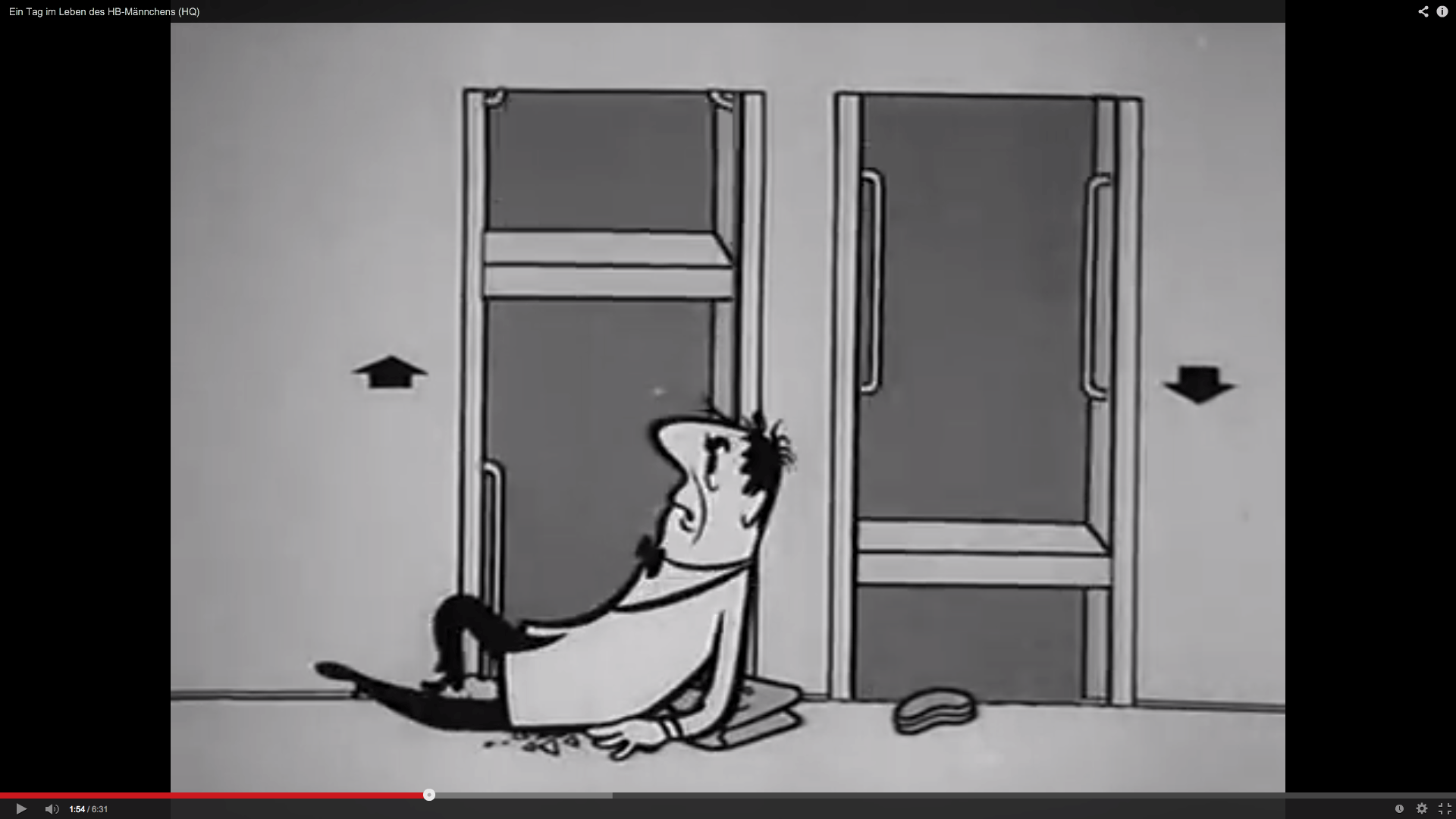 HB-Männchen Bruno scheitert an einem Paternoster-Aufzug (Screenshot aus: http://www.youtube.com/watch?v=5R6384xqWx4)