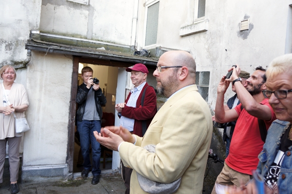 Führung durchs Stadtquartier: Matthias Hecht alias Dr. h. c. Wilfurt Loose (vorn), dahinter (mit roter Kappe) Rolf Dennemann. (Foto: Isabelle Reiff)