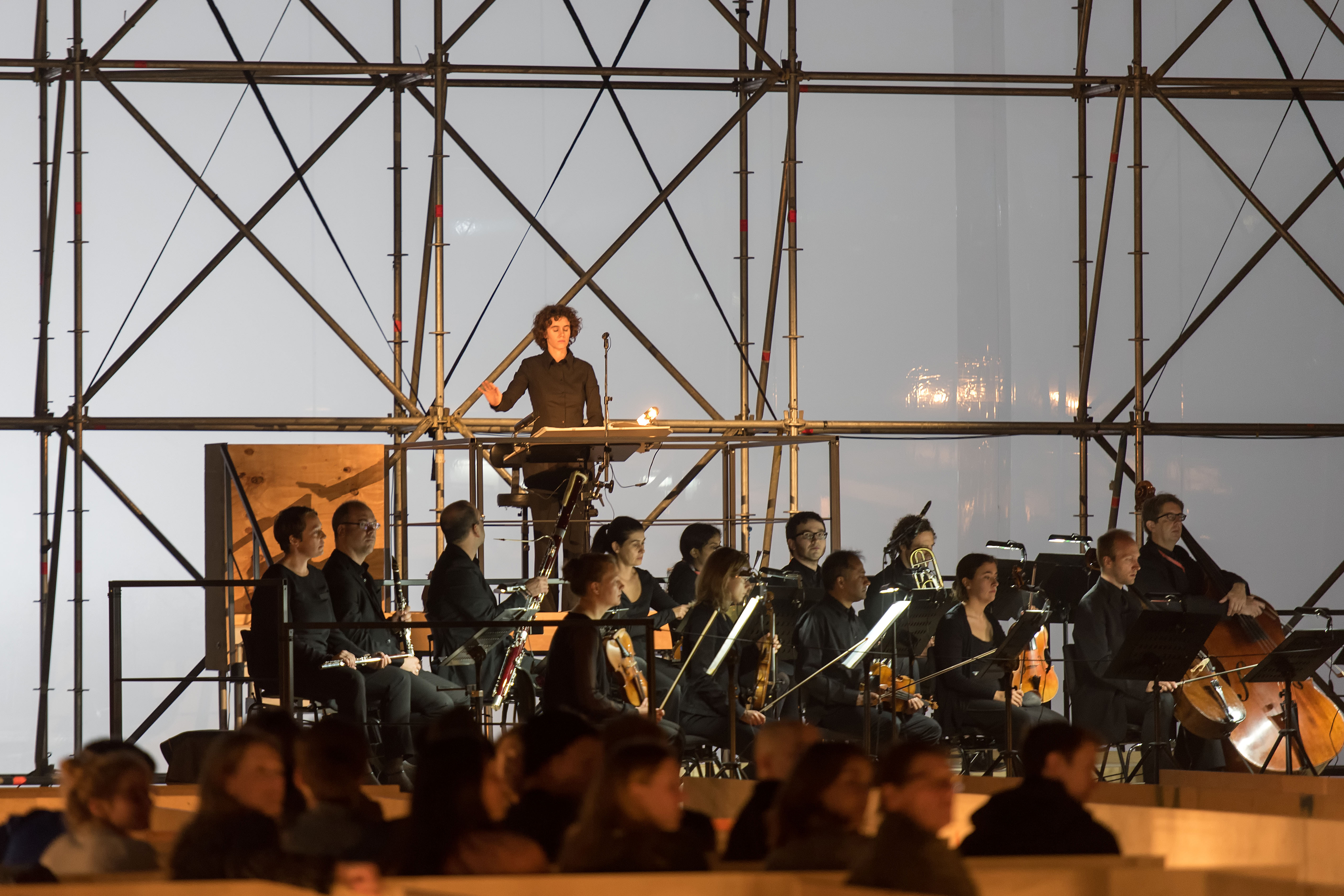 Matilda Hofman an einem der beiden riesigen Dirigentenpulte. Foto: Wonge Bergmann