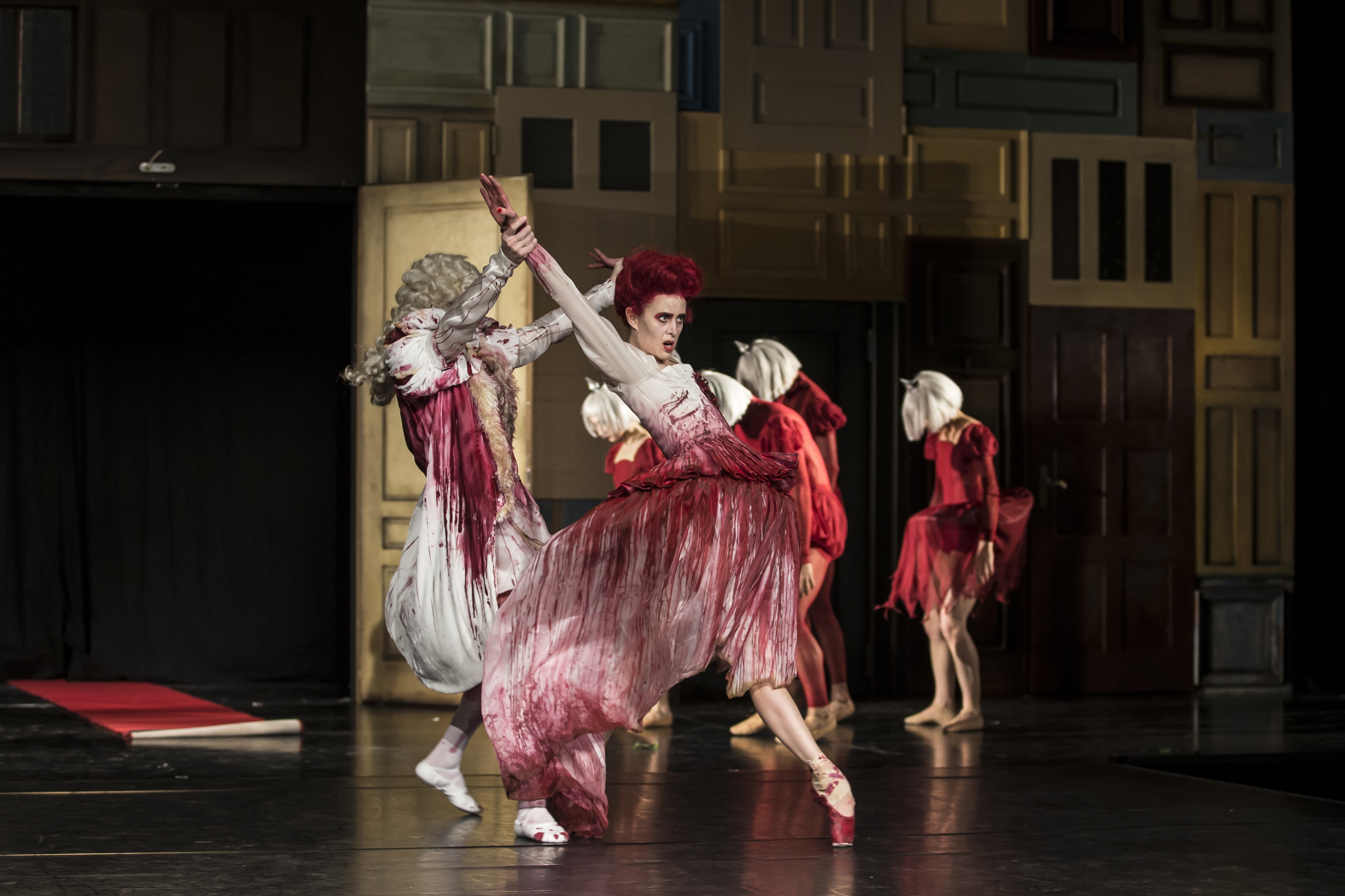 Gelsenkirchens Ballettchefin Bridget Breiner als blutbefleckte Herzkönigin (Foto: Costin Radu/Musiktheater im Revier)