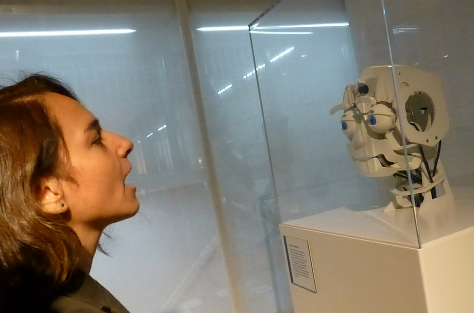 Mimik-Nachahmung mit Hindernissen: Der Roboterkopf hat offenbar noch nicht „erkannt“, dass die Frau den Mund geöffnet hat – und schaut etwas begriffsstutzig drein. (Fot: Bernd Berke)