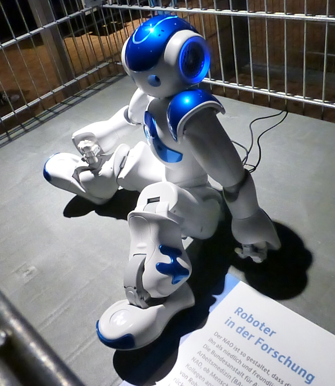 Roboter „Nao“ hat sich nach entsprechender Anweisung hingesetzt. (Foto: Bernd Berke)