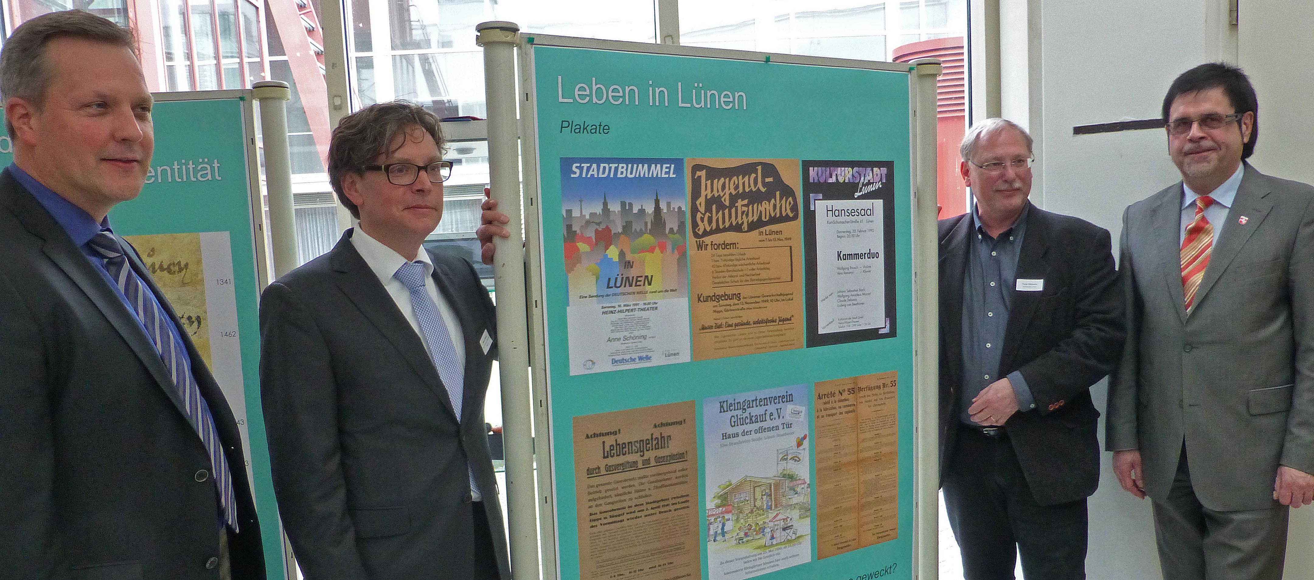 Das dürftige Lokalteil-Foto kann man bei uns auch kriegen (von links): Lünens Bürgermeister Jürgen Kleine-Frauns, LWL-Archivamtsleiter Dr. Marcus Stumpf, Lünens Stadtarchiv-Leiter Fredy Niklowitz und Michael Pavlicic (stellv. Vorsitzender der Landschaftsversammlung Westfalen-Lippe), versammelt um eine Stellwand mit alten Lüner Plakaten. (Foto: BB)
