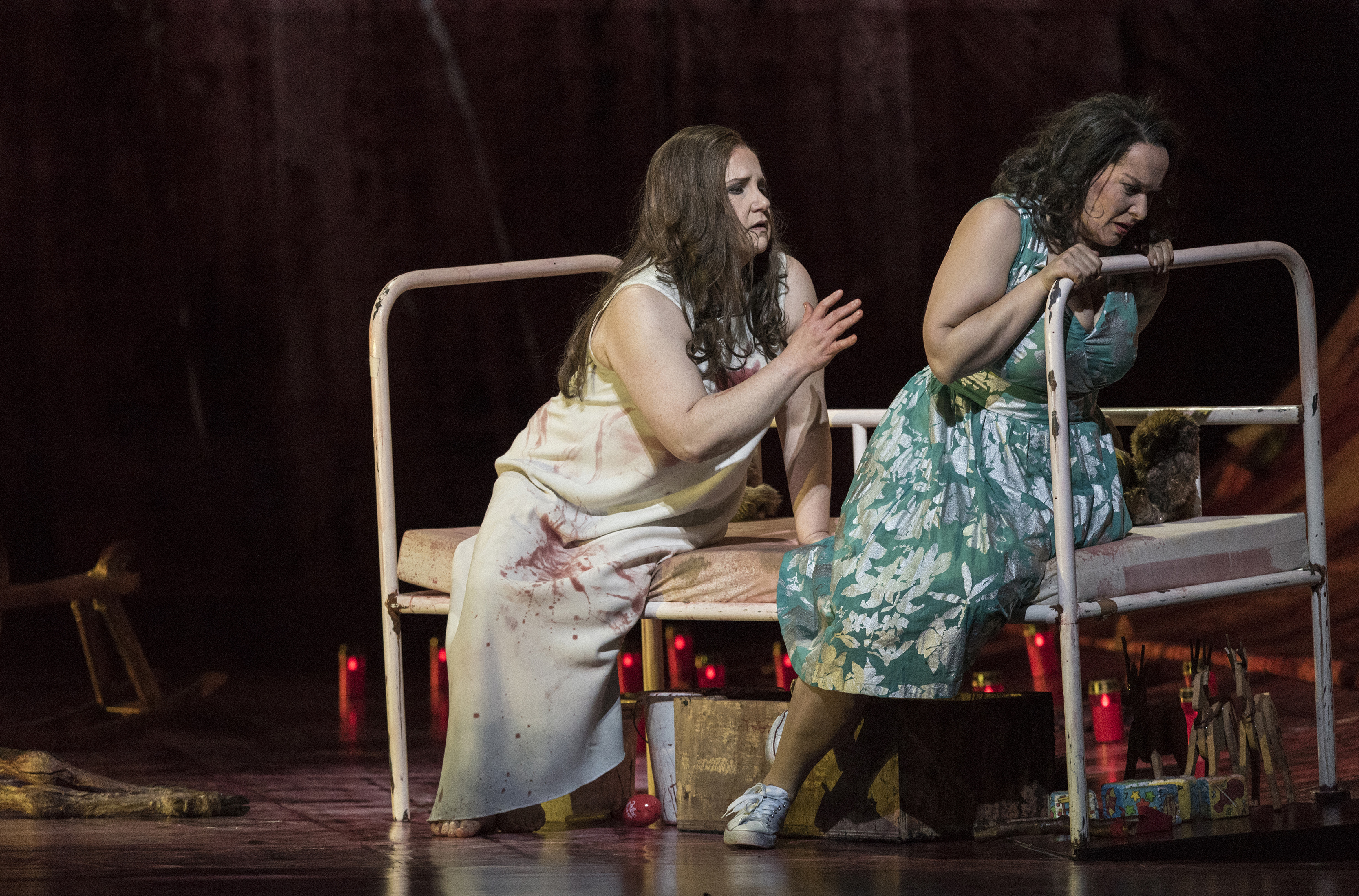 Ungleiche Schwestern: Elektra (Rebecca Teem, l.) und Chrysothemis (Katrin Kapplüsch. Foto: Matthias Jung)