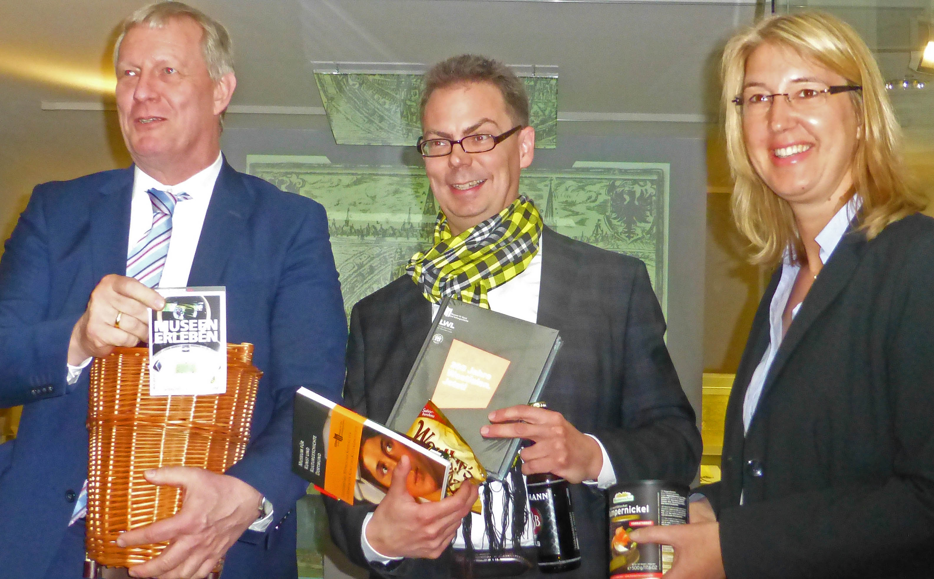 Im Präsentkorb für den „Neuen“ war auch ein schwarzgelber Schal: Kulturdezernent und Stadtkämmerer Jörg Stüdemann (li.), der neue Museumsleiter Jens Stöcker (Mi.) und Elke Möllmann, Geschäftsleiterin der Dortmunder Museen. (Foto: Bernd Berke)