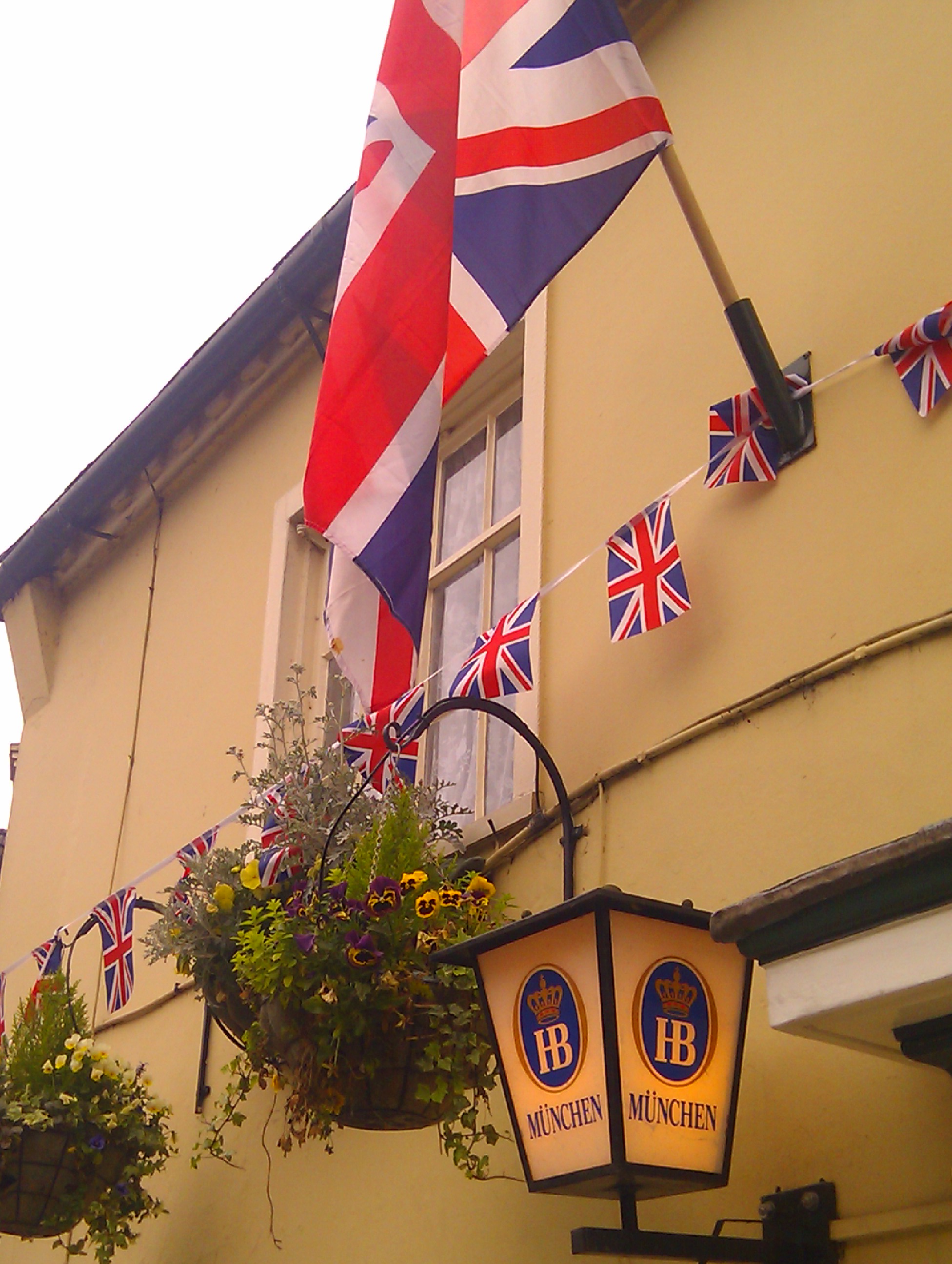 Die Nation flaggt für ihre Königin. Dass unter der Fahne für Münchner Bier geworben wird, stört nicht. Foto: Werner Häußner