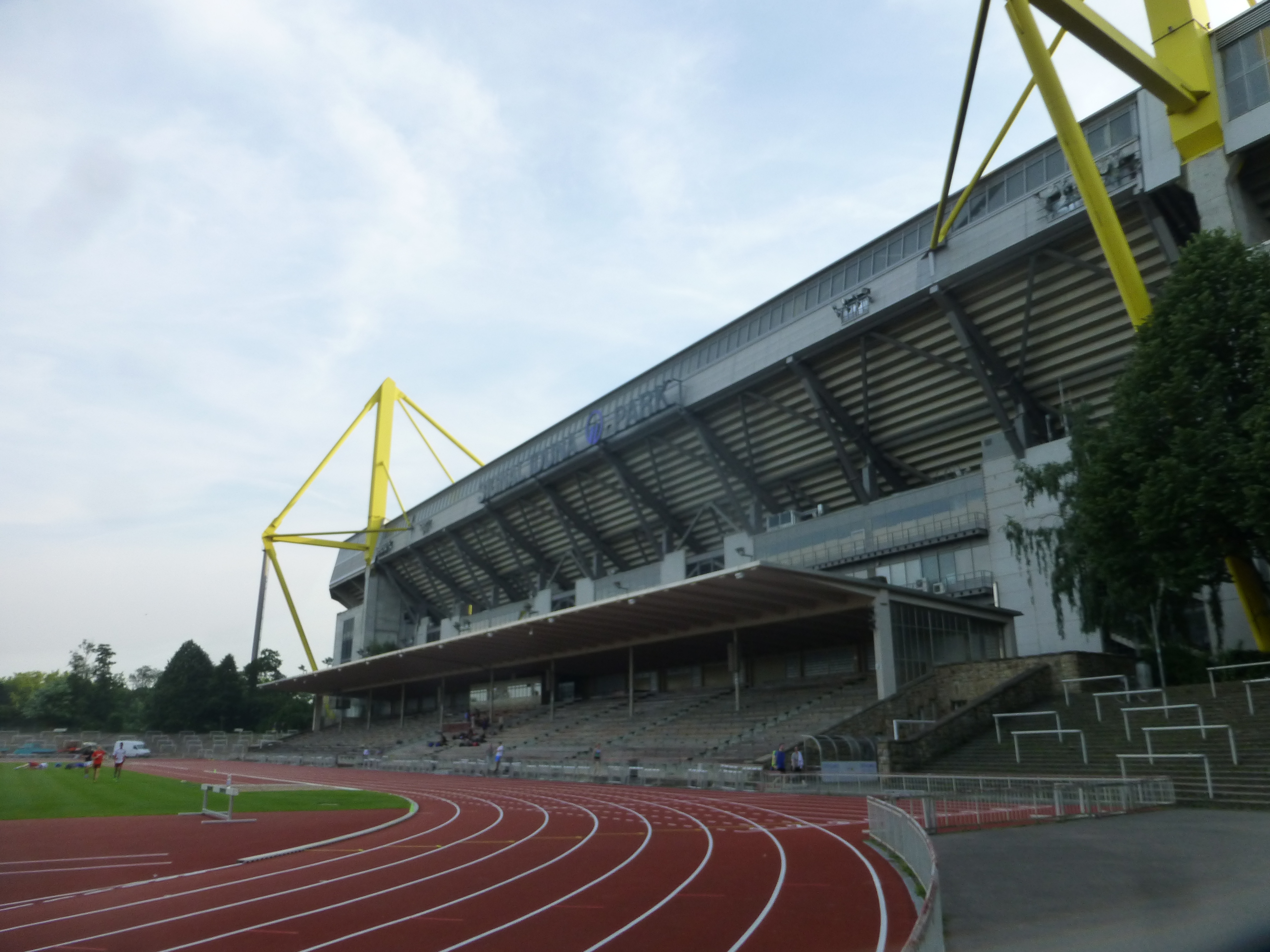 Gigantisch: Heute überragt die Tribüne des Westfalenstadions (vulgo Signal-Iduna-Park) jene der Kampfbahn Rote Erde bei weitem. (Foto: Bernd Berke)