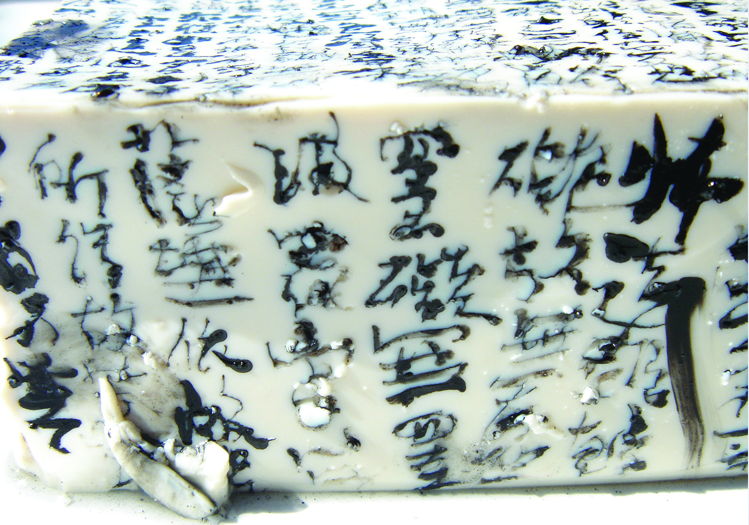 Charwei Tsai: „Tofu Mantra“ (schwarze Tusche auf frischem Tofu), Fotografie, 2005 (Copyright: the artist and Fondation Cartier)