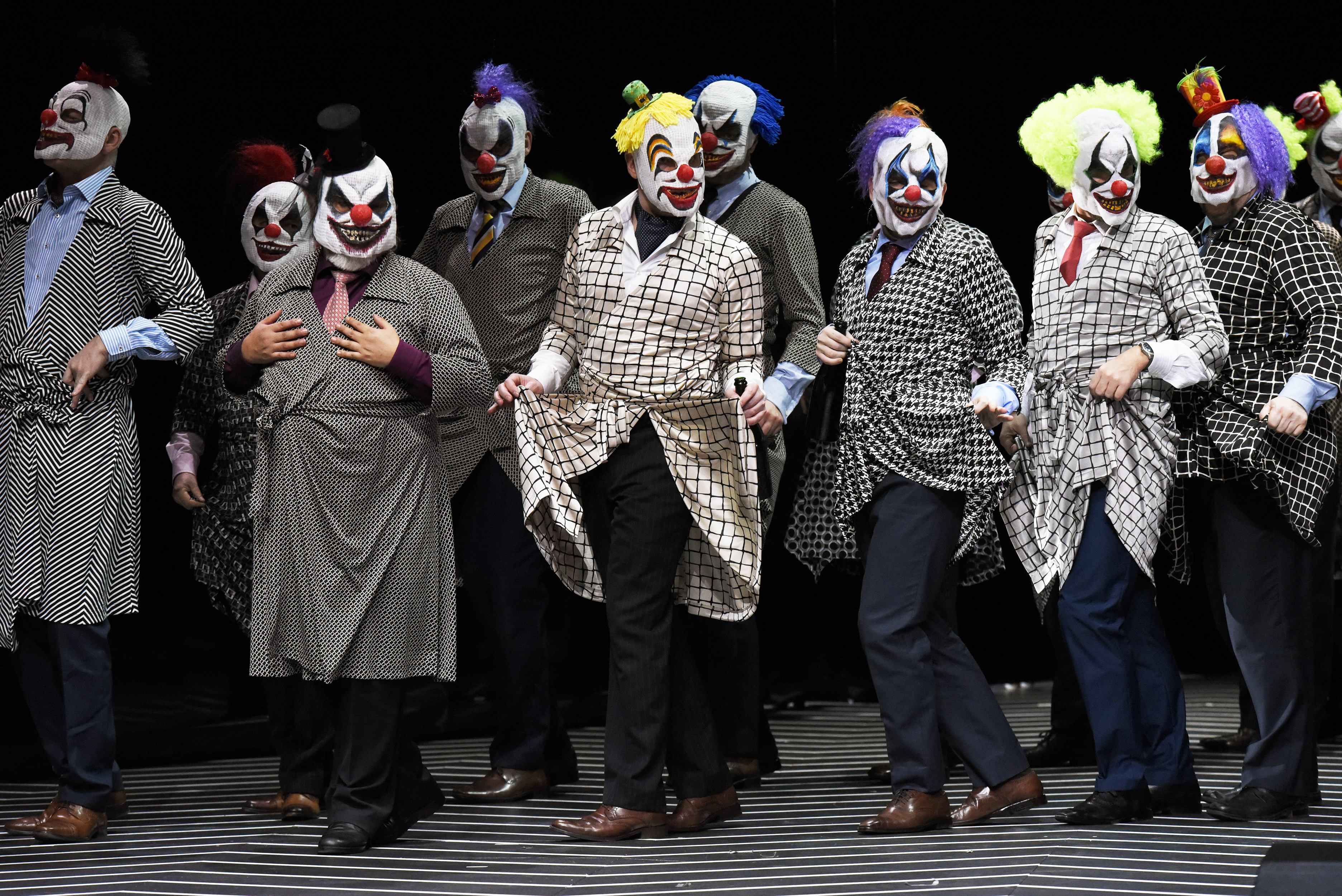 Die Höflinge als eine Schar von Horrorclowns (Foto: Matthias Jung/Aalto-Theater)