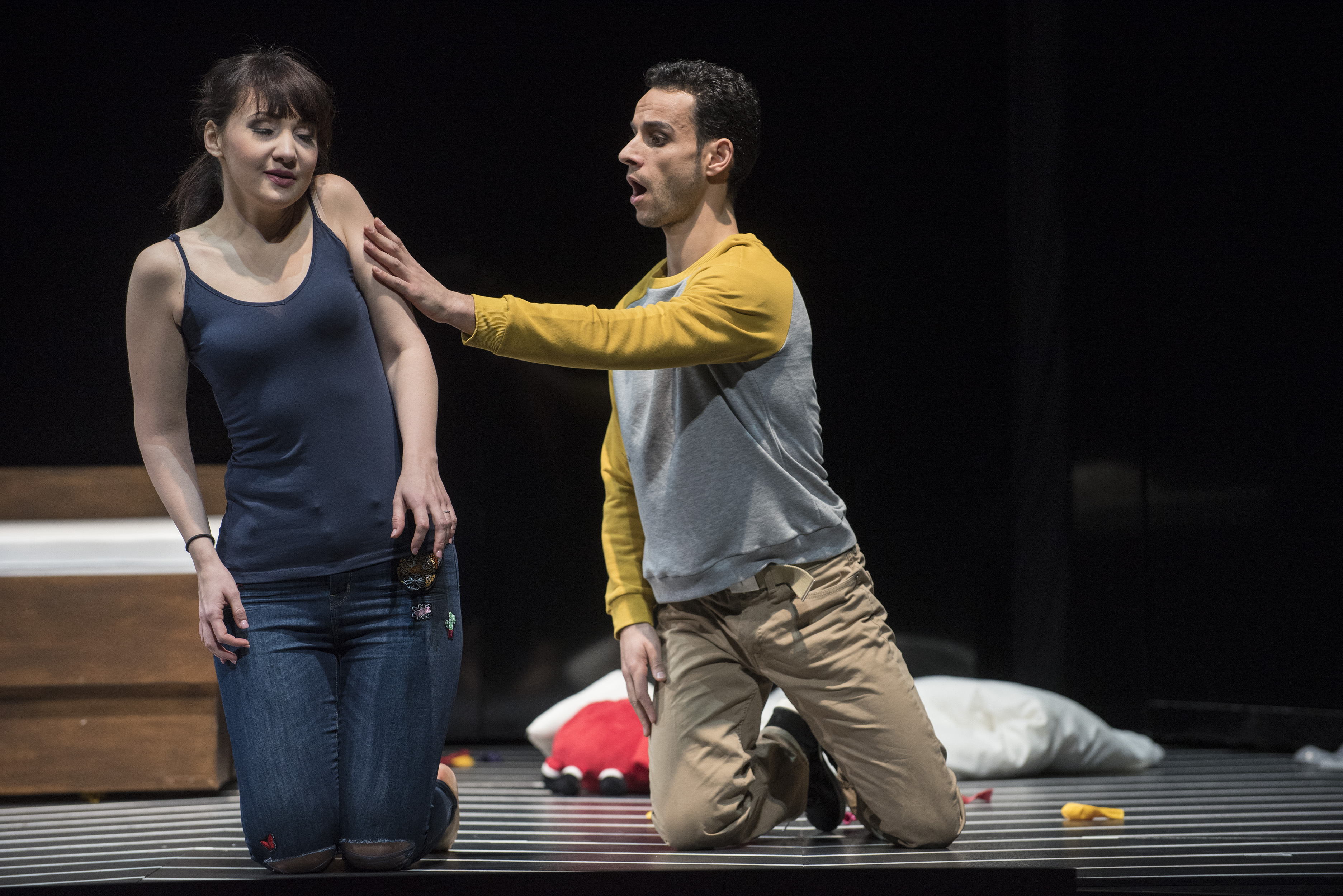 Der Herzog (Carlos Cardoso, r.) gibt sich Gilda gegenüber als Student aus (Cristina Pasaroiu,. Foto: Matthias Jung/Aalto-Theater)