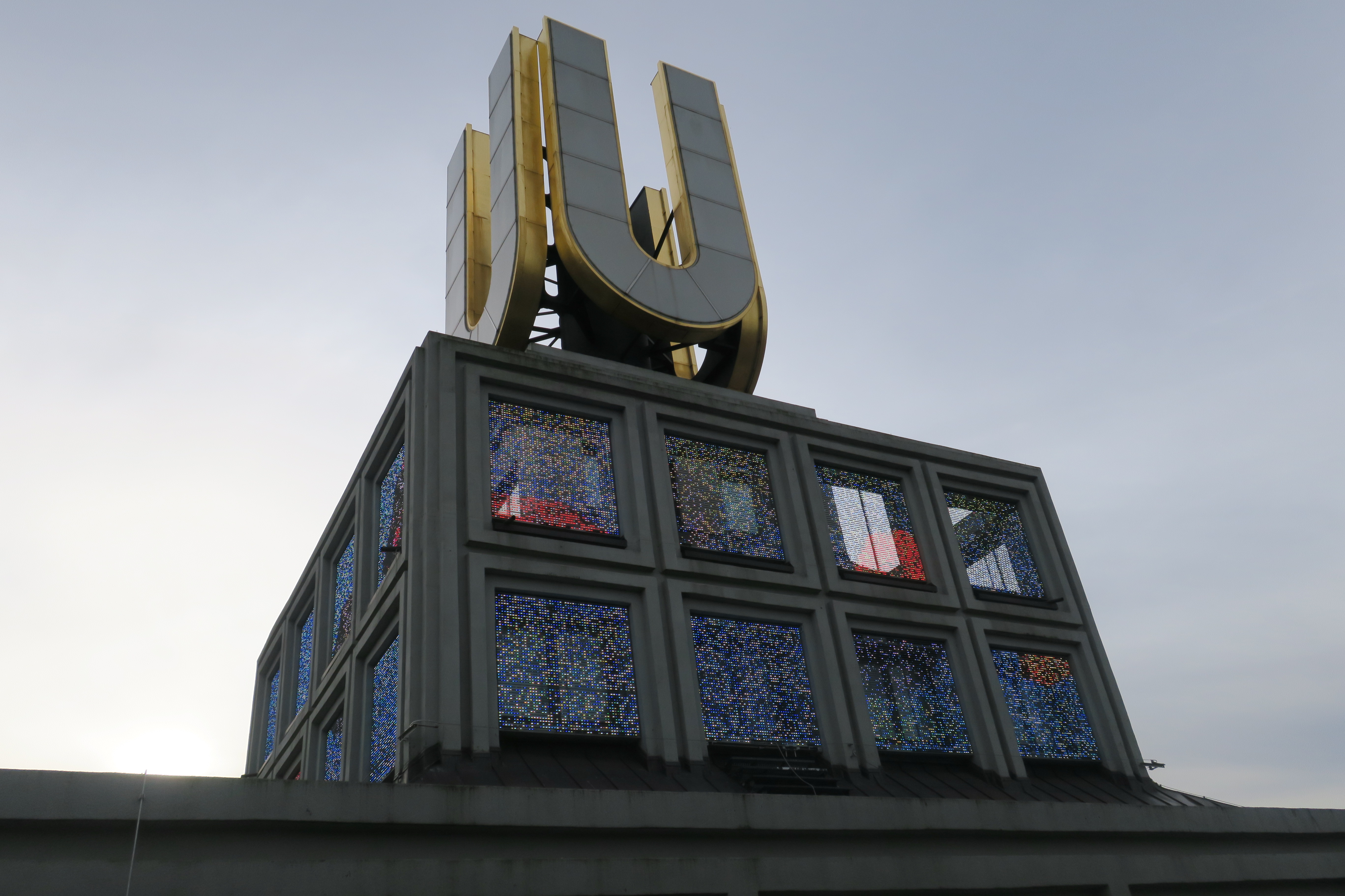 Ein golden eingefasster Buchstabe krönt das Dortmunder „U“, die filmischen Installationen stammen von Adolf Winkelmann. (Foto von Dezeber 2016: Bernd Berke)