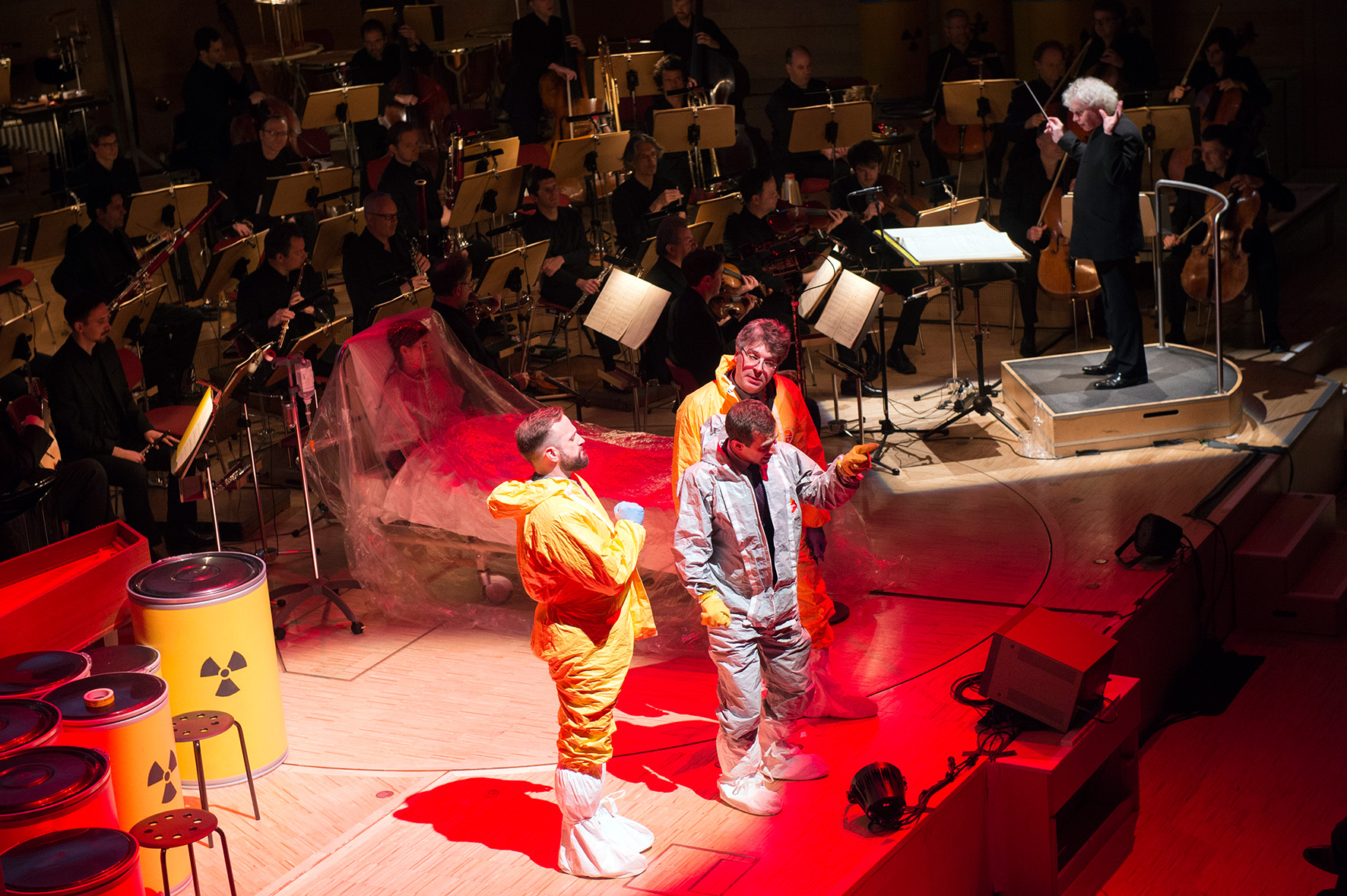Der „große Makabre“ landet bei Regisseur Peter Sellars im Atomzeitalter. Hier sehen wir den Fürsten Gogo (Anthony Roth Costanzo, Mitte) und seine Getreuen (Foto: Monika Rittershaus)
