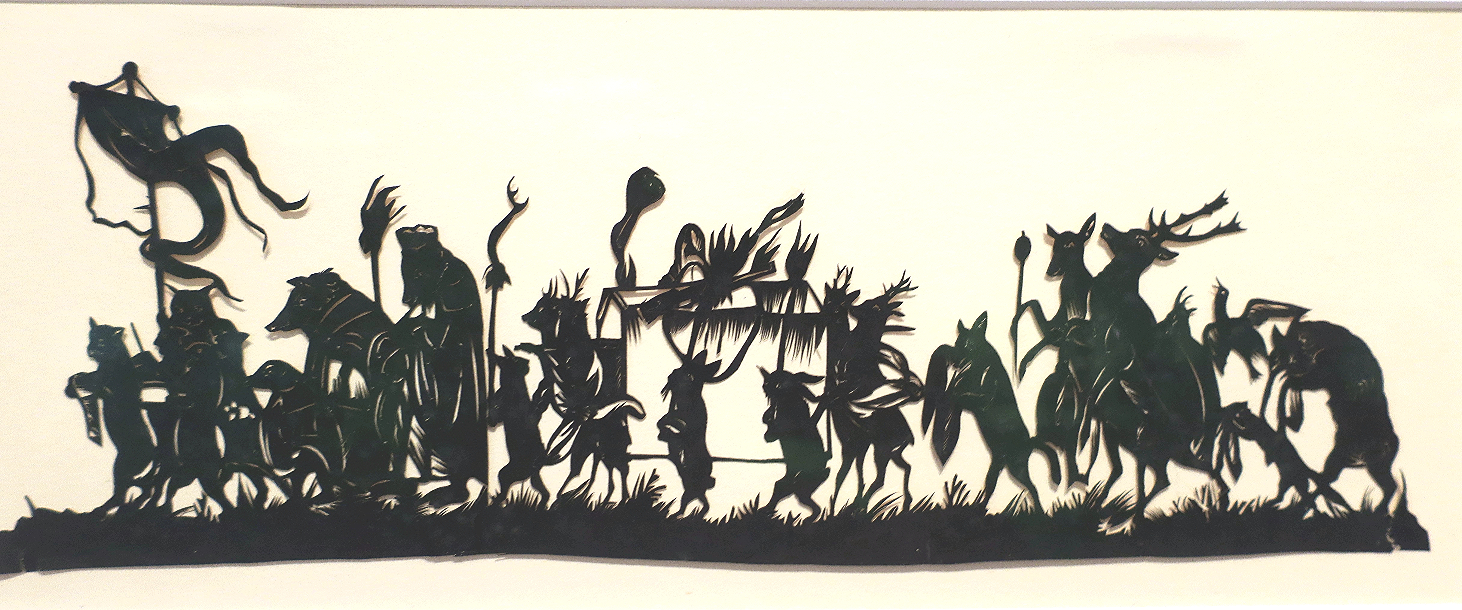 Unsigniert und namentlich nicht zuzordnen: filigraner Scherenschnitt „Leichenzug der Tiere“. (© Gustav-Lübcke-Museum / Foto: Bernd Berke)