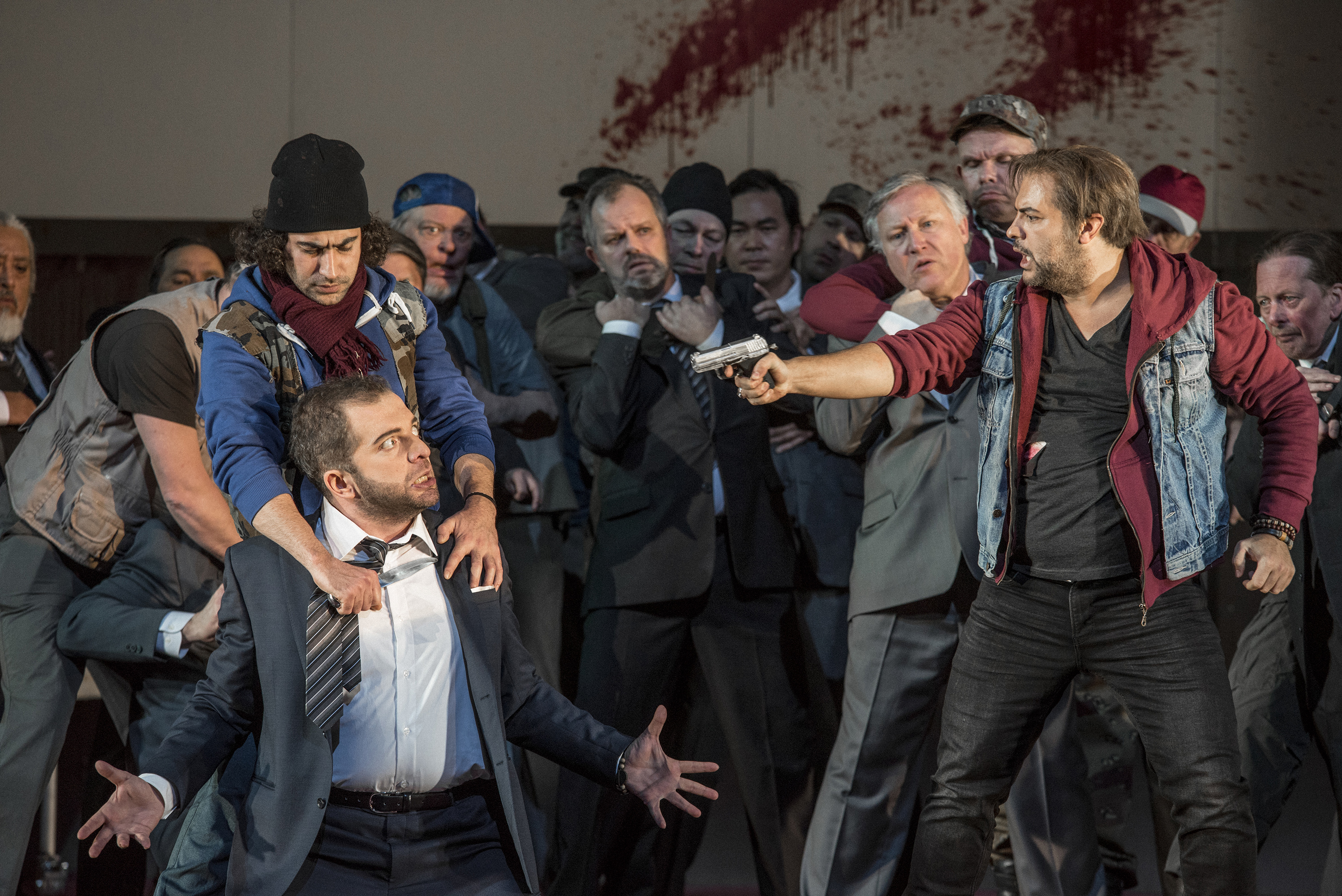 Manrico (Gaston Rivera, r.) zielt auf den Grafen Luna (Nikoloz Lagvilava. Foto: Matthias Jung)