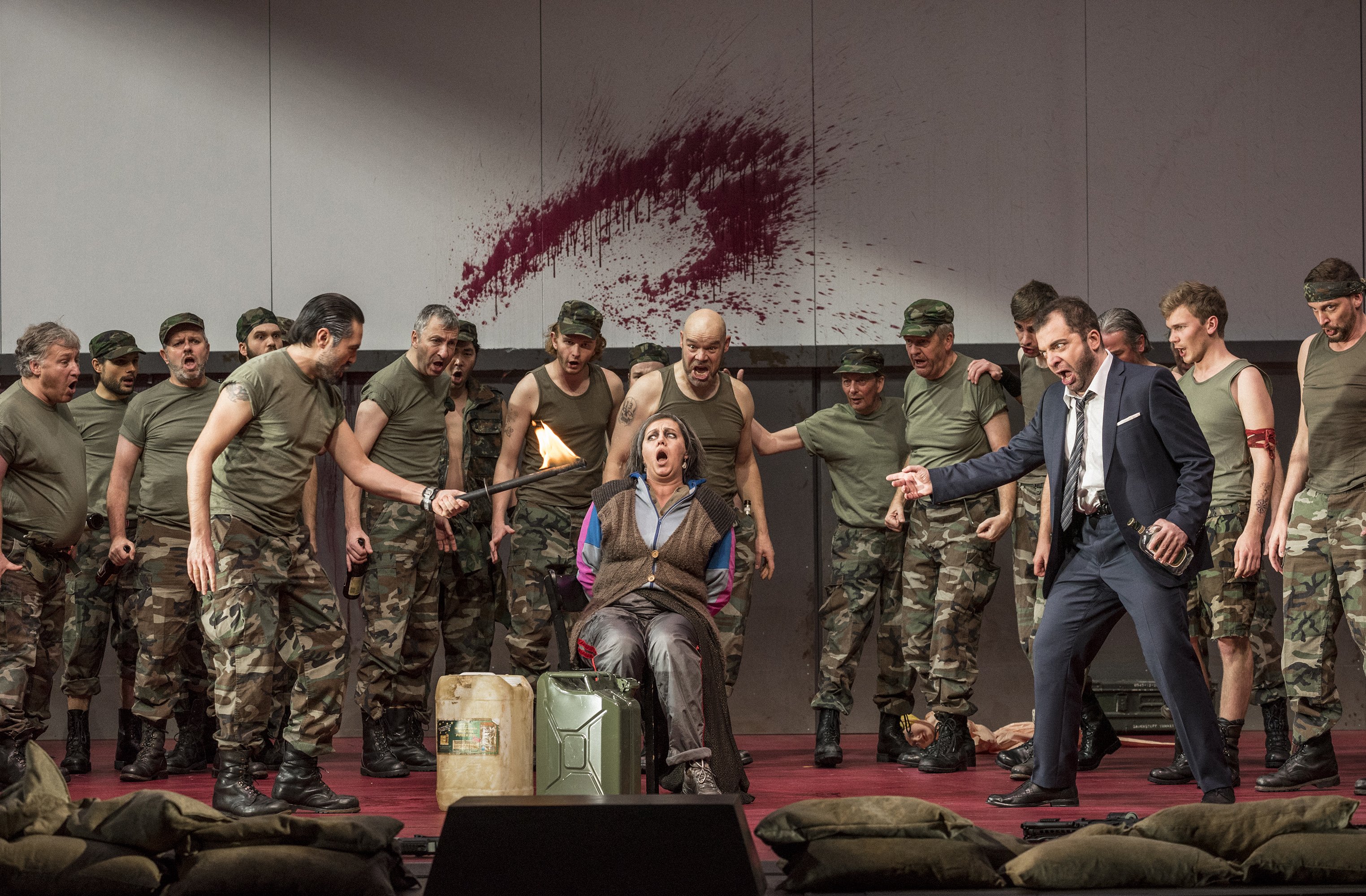 Eine verrohte Soldateska droht, die Zigeunerin Azucena (Carmen Topciu) in Brand zu stecken (Foto: Matthias Jung)
