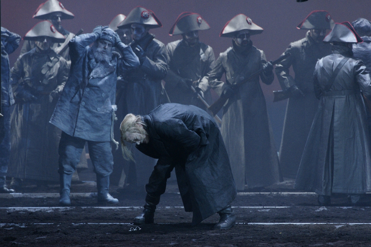 Der Krieg: Matthias Klink als von Schmerz und Qual gekrümmter Pierre Besuchow - eine der drei Hauptfiguren von Prokofjews Oper. Foto: Karl und Monika Forster