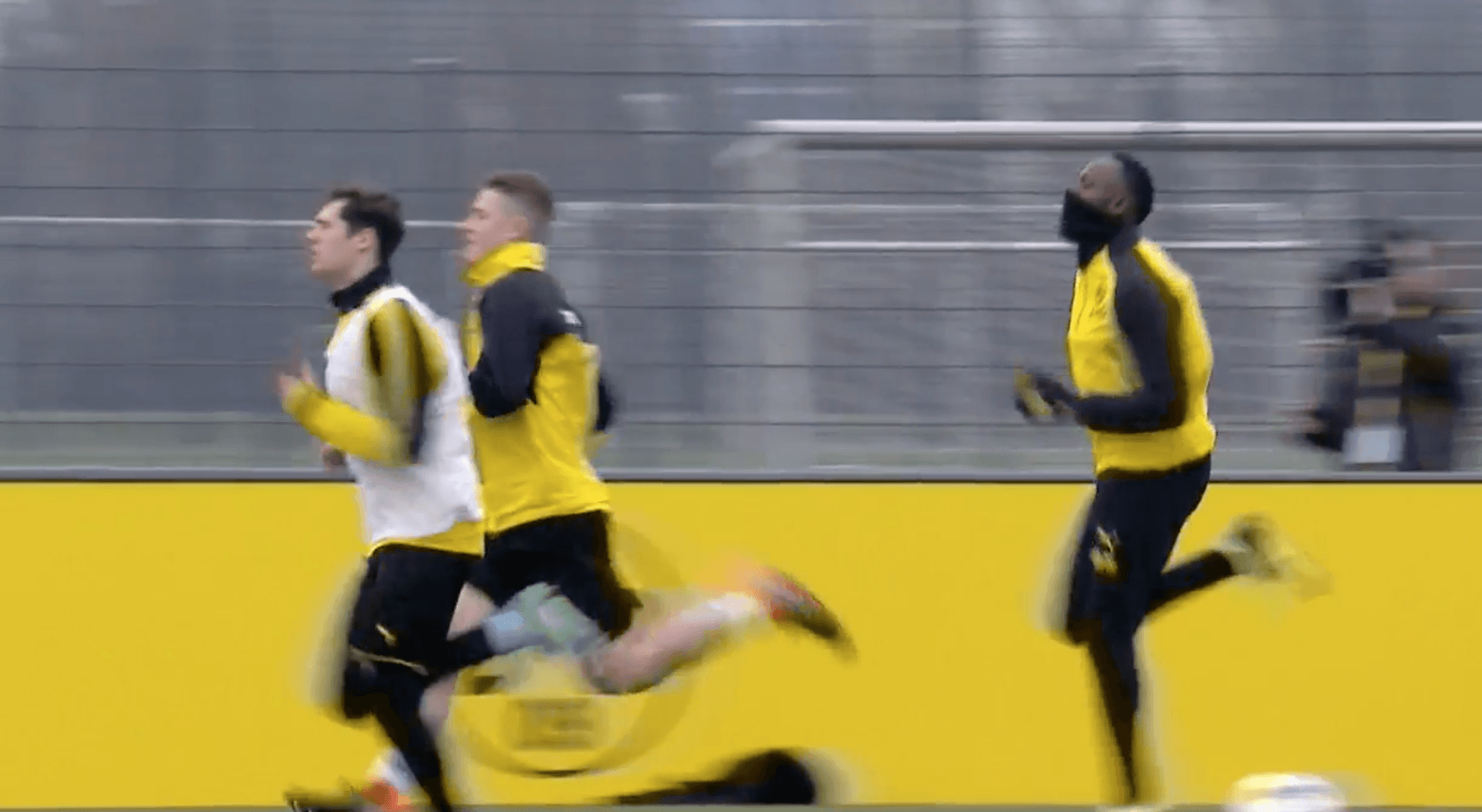 Usain Bolt (rechts) beim Lauftraining im BVB_Trikot. (Screenshot vom YouTube-Kanal des BVB)